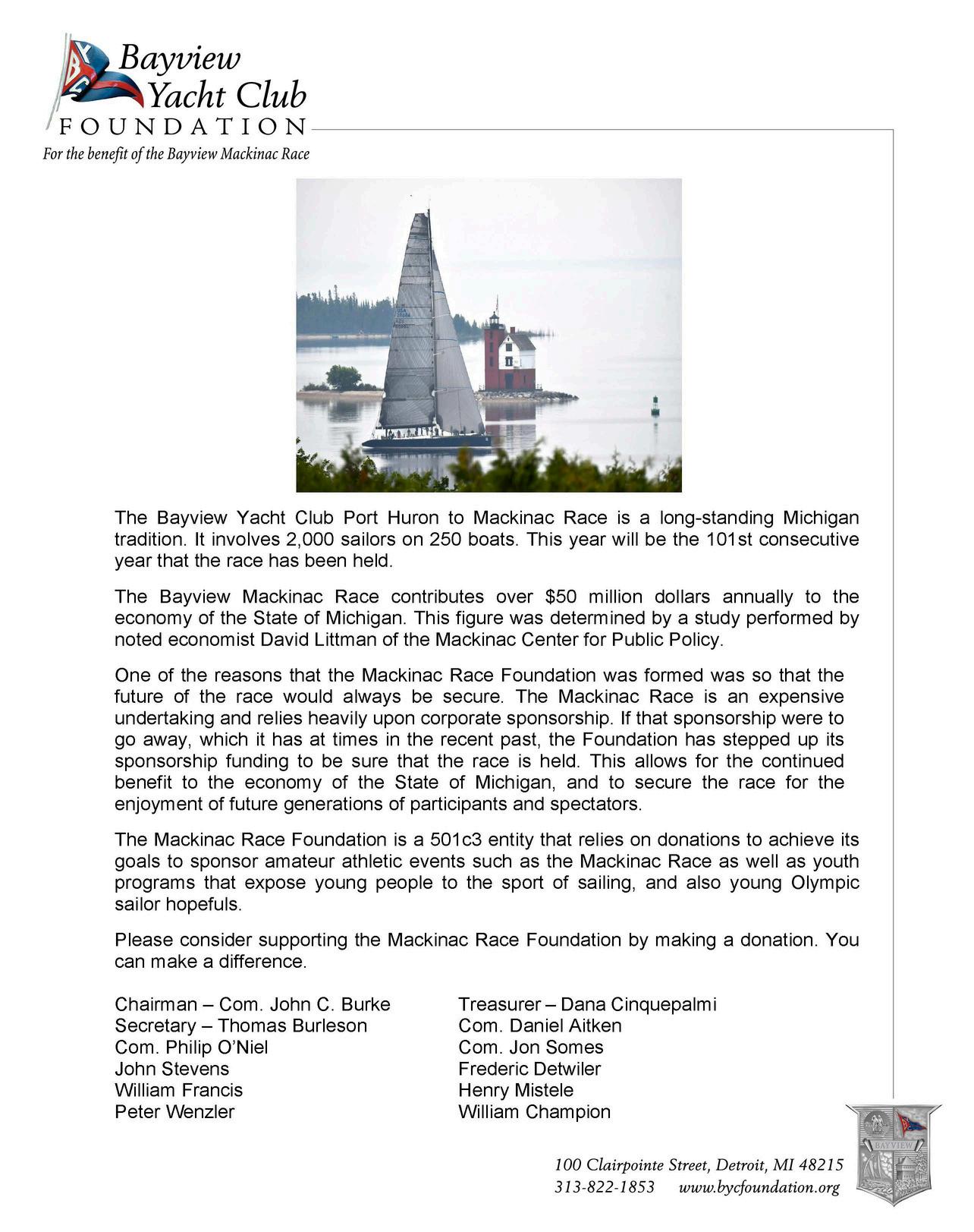 Also, the Mackinac Race Foundation, whose purpose is to ensure the Bayview Mackinac Race continues forever, provides a level of support that helps us do just that.