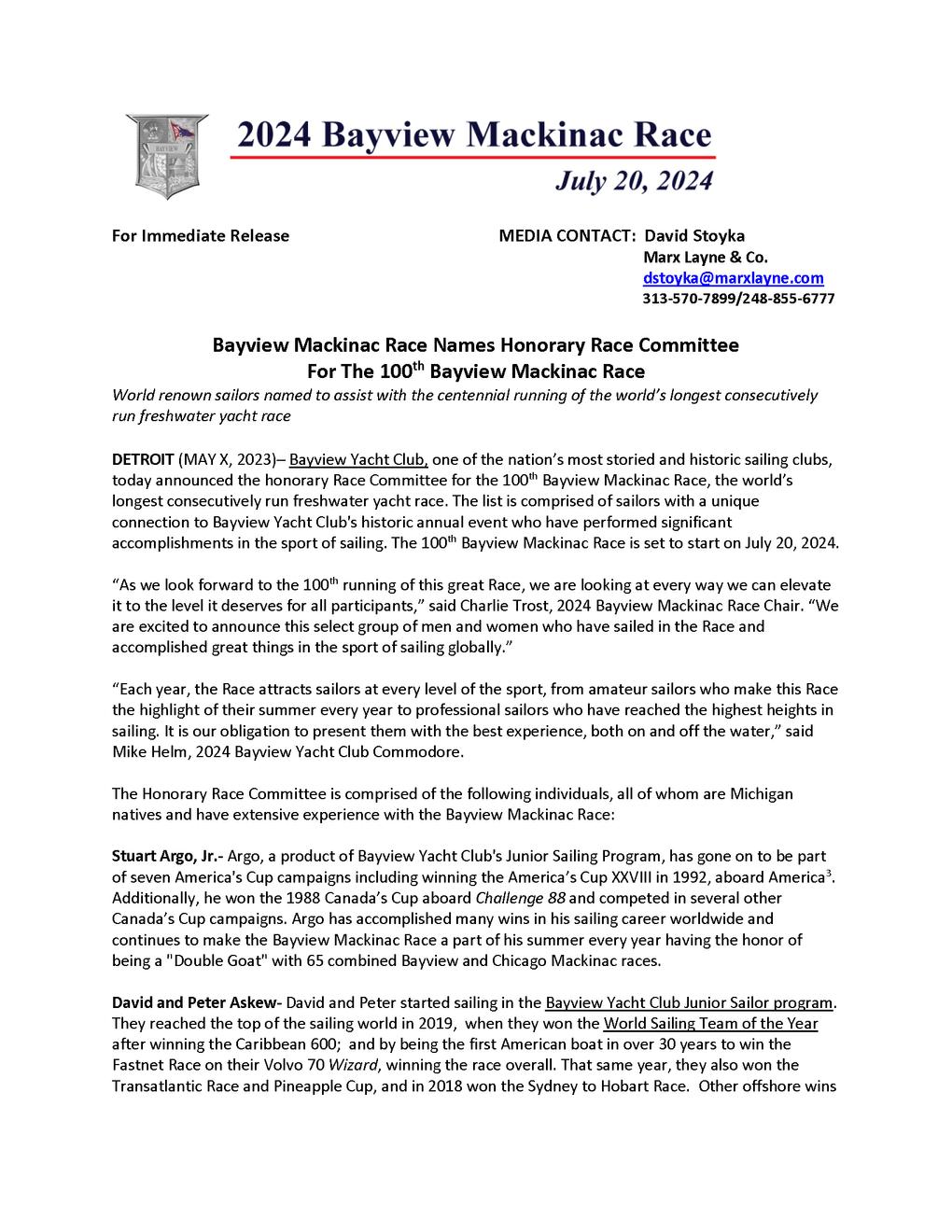 As I sit here thinking of the thousands of people sailing and supporting the Bayview Mackinac Race over the past 100 years, I am grateful to be a part of such a memorable experience. There will be many more updates, but we hope to see you all at the finish line in 2024!