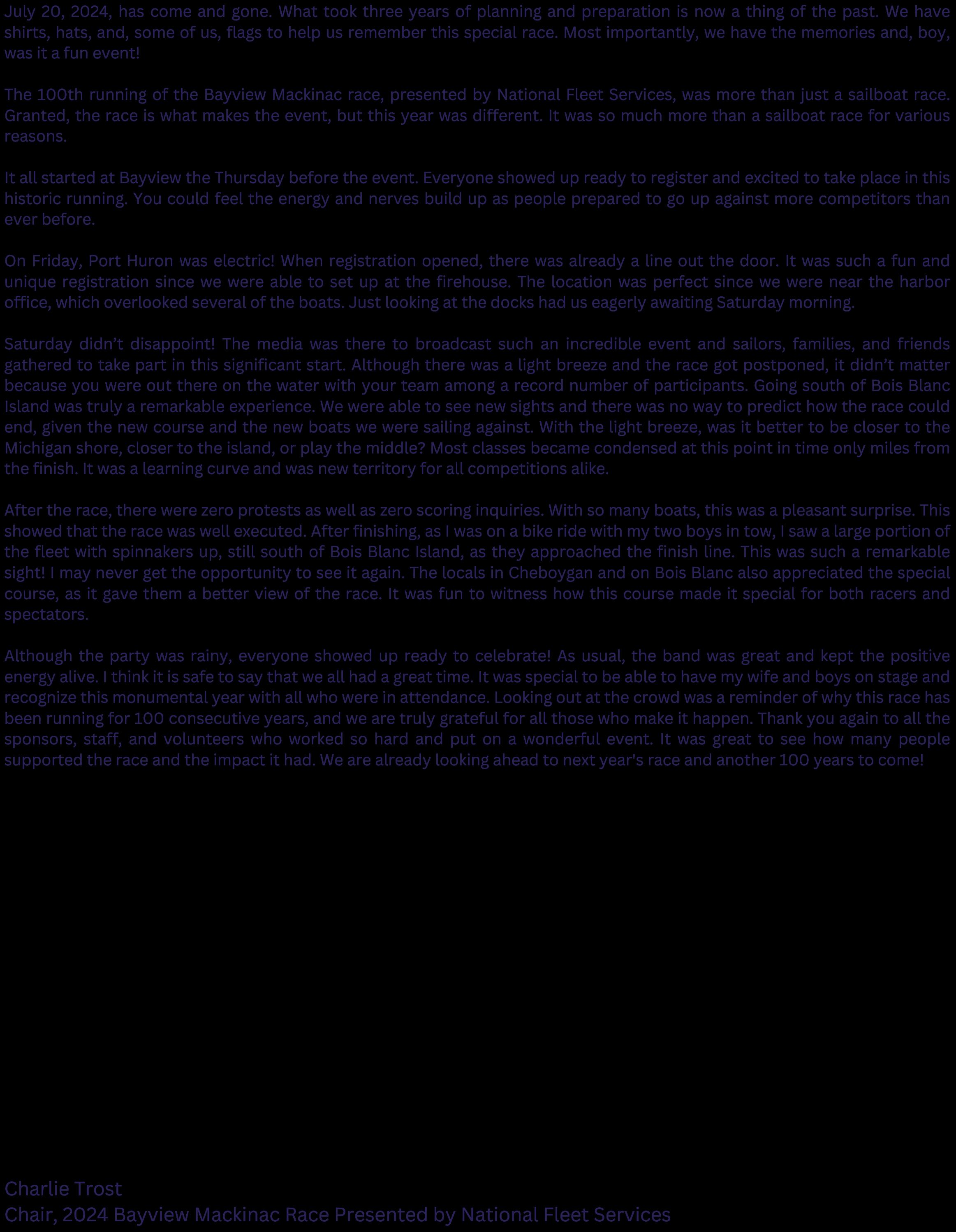 I am very happy to report that the PortHuron-t-Mackinac race, a cherished tradition for so many of us, was a standout event this year The 100th continuous running of the race will surely be talked about for years to come. Participation was strong, and I was particularly struck by the level of commitment from our volunteers. Their efforts behind the scenes are what make this race possible We owe them our deepest gratitude. The feedback from racers has been overwhelmingly positive, with many of you sharing stories of both challenge and triumph. These tales remind us of why we return year after year, drawn by the unique combination of competition and camaraderie that the race fosters. I was happy to see so many of you and your families on the island, and I hope to see you againnextyear