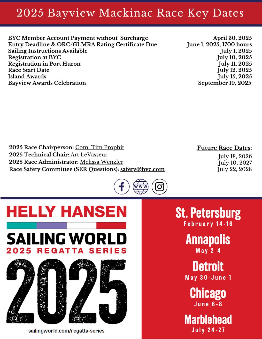 Ifyouhaven’tregisteredyet,pleasedoso.Tellallyour friendswhoownboatstoregister;thereisaplacefor everybody,andthere’snotimelikenowtogetstarted on,orreturntoBayviewMackinacracing.Everything neededtoregister,obtainaratingcertificate,review SafetyEquipmentRequirements(SER’s)andmuch, muchmoreareavailableontheracewebsite, www.bycmack.com