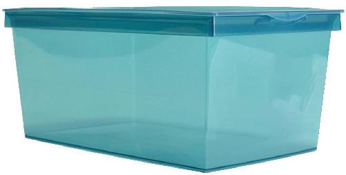 En polypropylène, naturel ou bleu, avec couvercle clipsé, 2,49 e(éco-part 0,08 e) en 6 L, 34,3 x 21 x 13,2 cm, 3,99 e(éco-part 0,18 e) en 18 L, 41,8 x 35 x 18,7 cm et 9,99 e(éco-part 0,37 e en 33 L, 73 x 40 x 16,5 cm.
