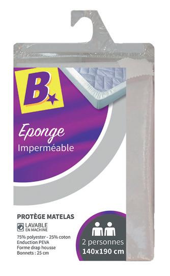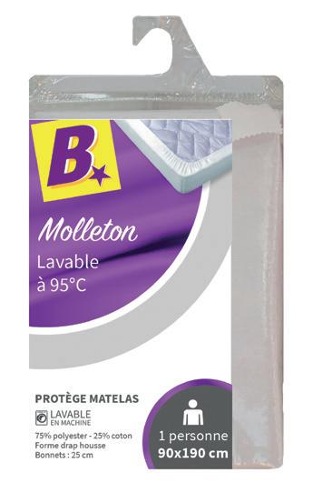 couette bicolore flanelle/microfibre Enveloppe 1 face microfibre 100 % polyester et 1 face 100 % coton flanelle uni, garnissage polyester fibre creuse siliconée 350 g/m², piquage lignes droites finition biais fantaisie, bleu nuit/green tea ou bourgogne/gris perle, 24,99 e (éco-part 0,12 e) en 140 x 200 cm et 39,99 e (éco-part 0,18 e) en 220 x 240 cm. L’oreiller à mémoire de forme 50 x 70 cm, enveloppe 100 % coton, garnissage 50 % polyester siliconé creux, 50 % polyuréthane mousse viscoélastique à mémoire de forme, fermeture à glissière permettant de moduler le volume. Éco-part inclus 0,06 e LOT DE 2 oreillers “Aloe vera” 60 x 60 cm, microfibre 100 % polyester enrichi à l’aloe vera, garnissage polyester fibre creuse siliconée 450 g. Éco-part inclus 0,12 e Protège matelas imperméable 140 x 190 cm, forme drap housse, dessus éponge 75 % polyester, 25 % coton avec enduction PVC 160 g/m², flancs en maille extensible 100 % polyester 60 g/m². Le rénove matelas 100 % polyester 70 g/m², 6,99 e en 90 x 190 cm et 8,99 e en 140 x 190 cm.