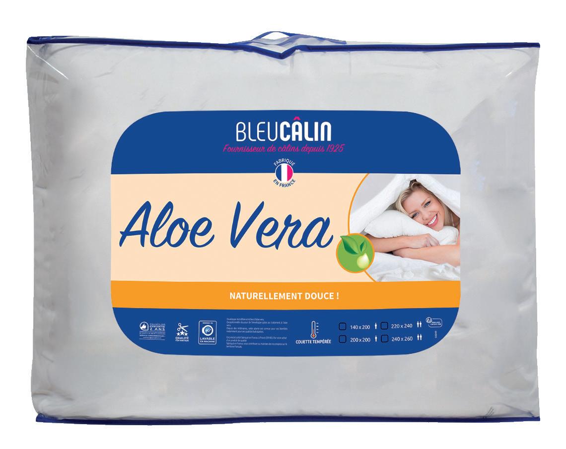 La couette “Aloe vera” Enveloppe microfibre 100 % polyester enrichi à l’aloe vera, garnissage polyester fibre creuse siliconée tempérée 250 g/m², piquage lignes droites finition biais, 16,99 e (éco-part 0,12 e) en 140 x 200 cm et 27,99 e (éco-part 0,18 e) en 220 x 240 cm.