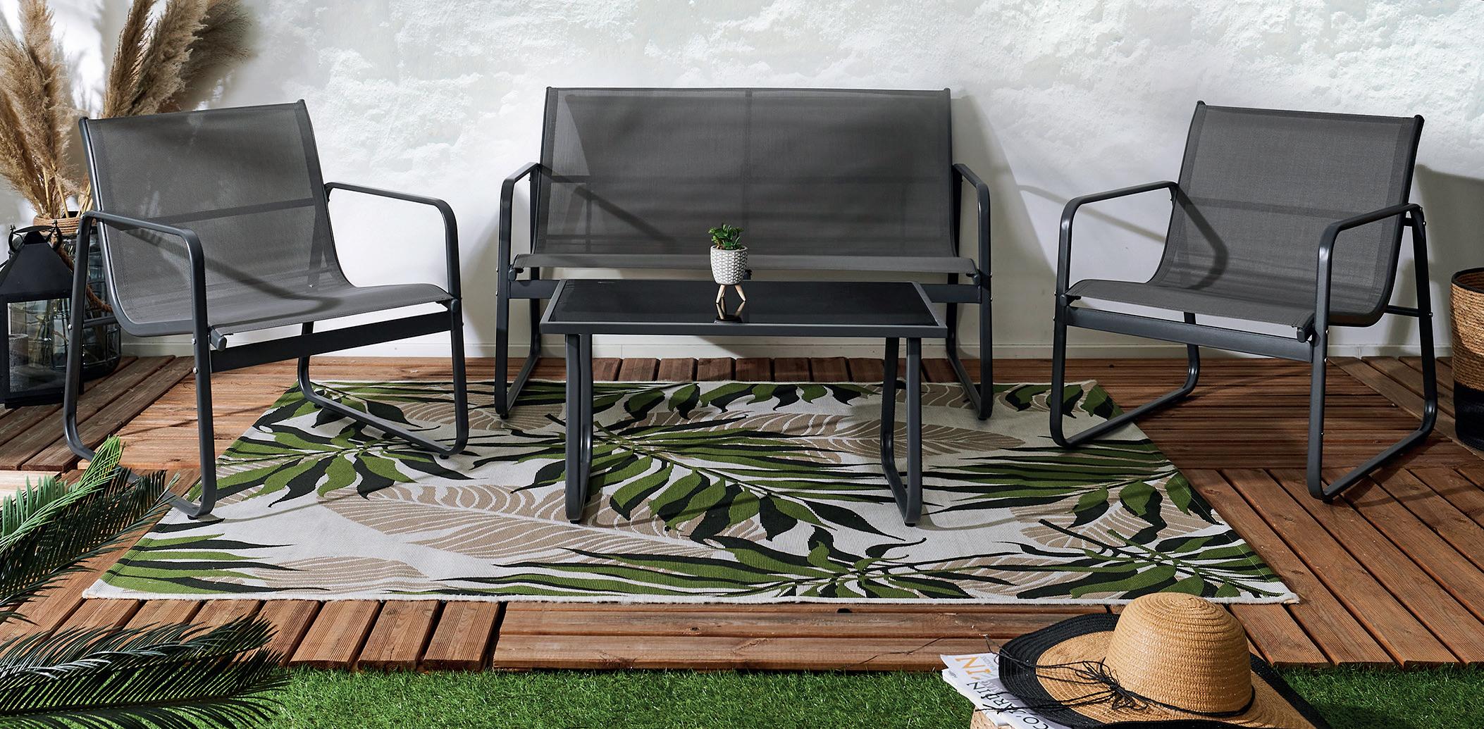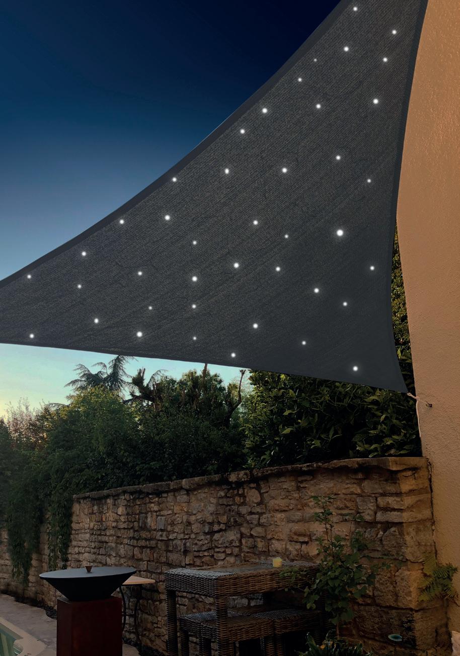 AVANTAGE CARTE 10e Salon “Baikal” 1 canapé 2 places 122 x 69 x 75 cm, 2 fauteuils 62 x 69 x 75 cm et 2 tables basses Ø 53 x 43 cm et Ø 73 x 35 cm, en acier époxy, coussins en fibre spun polyester 200 g/m2, à monter soi-même. Éco-part incluse 5,30 e Chaise “Lucena” 52,3 x 86,5 x 50 cm, en polypropylène résistant aux UV et fer époxy, à monter soi-même. Éco-part incluse 0,55 e Voile lumineux “Ciel étoilé” 3 x 3 x 3 m, polyéthylène tressé haute qualité 180 g/m² avec ceinture de renfort 25 mm et anneau inox 5 mm, leds intégrées effet ciel étoilé, perméable et respirant, capteur solaire avec détecteur crépusculaire. Table extensible “Tortuga” 150/200 x 90 x 75 cm, en aluminium et acacia, à monter soi-même. Éco-part incluse 1,38 e 47.99 e 279e 269e 22.99 e Le voile d’ombrage en jute En fibre de jute naturelle 300 g/m², ceinture de renfort terminée par une boucle à chaque extrémité, 37,99 e en 3 x 3 x 3 m, 47,99 e en 3 x 2 m et 49,99 e en 3,6 x 3,6 x 3,6 m. À partir de 37.99 e 3 x 3 x 3 m 3 x 3 x 3 m 8 DISPONIBLE EN MAGASIN à partir du 21 mai
