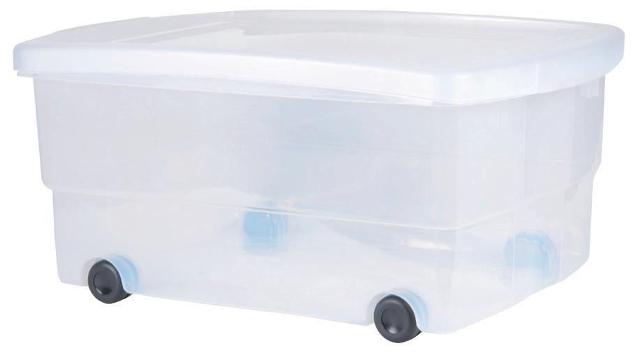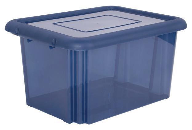 En polypropylène, avec couvercle clipsé, bleu ou naturel, 3,99 e (éco-part 0,12 e) en 39 x 31,5 x 22,5 cm 18 L et 9,99 e (éco-part 0,20 e) en 57,5 x 44 x 31 cm.