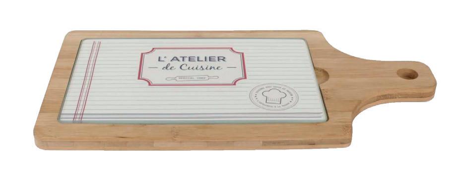 La planche à découper 38,4 x 28,8 x 1,5 cm, en verre et bois, 2 modèles.