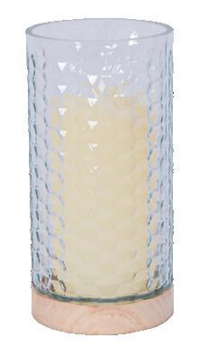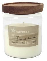 La bougie parfumée acacia Pot en verre, couvercle acacia, 6,49 e en H 11,5 cm et 7,99 e en H 16,5 cm.
