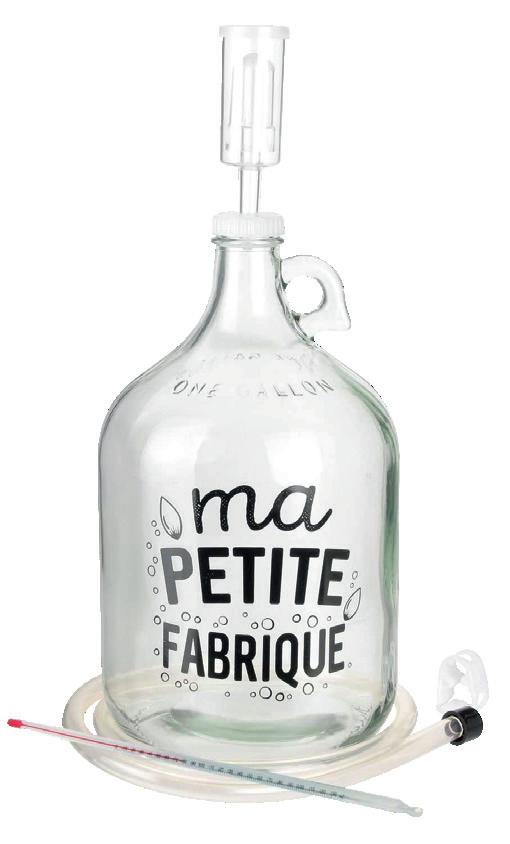 Contient 1 bonbonne en verre “Dame Jeanne” 3,7 L, 1 bouchon percé et barboteur en U, 1 thermomètre en verre, 1 système de soutirage avec anti-lie et valve, 1 notice détaillée de la méthode tout grain, ingrédients non-inclus. Support de table avec crochet