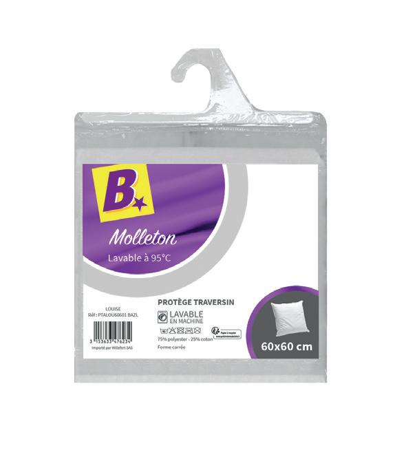 100 % coton, qualité percale, finition passepoil, fermeture à glissière permettant de moduler le volume, garnissage 50 % polyester siliconé creux, 50 % polyuréthane mousse viscoélastique à mémoire de forme. 11.99 e 7.99 e 9.89 e Traversin confort 140 cm, enveloppe 100 % polyester, garnissage 100 % polyester, 850 g. 6.99 e À partir de 2.79 e Retrouvez-nous sur et www.bazarland.fr Oreiller à mémoire de forme 750 grs 60 x 60 cm. Éco-part inclus 0,06 e Le protège matelas “Louise” 140 x 190 cm, molleton 75 % polyester, 25 % coton, 140 g/m², lavable à 95°C. L’oreiller anti-transpirant 60 x 60 cm, 100 % polyester, garnissage 100 % polyester creux siliconé 450 g, enveloppe microfibre. Éco-part inclus 0,06 e La parure de lit imprimée “Elton” 6,99 e en 140 x 200 cm + 1 taie d’oreiller 63 x 63 cm et 9,99 e en 240 x 220 cm + 2 taies d’oreiller, 100 % polyester. Protège oreiller “Louise” 60 x 60 cm, molleton 75 % polyester, 25 % coton, 140 g/m². 8.99 e