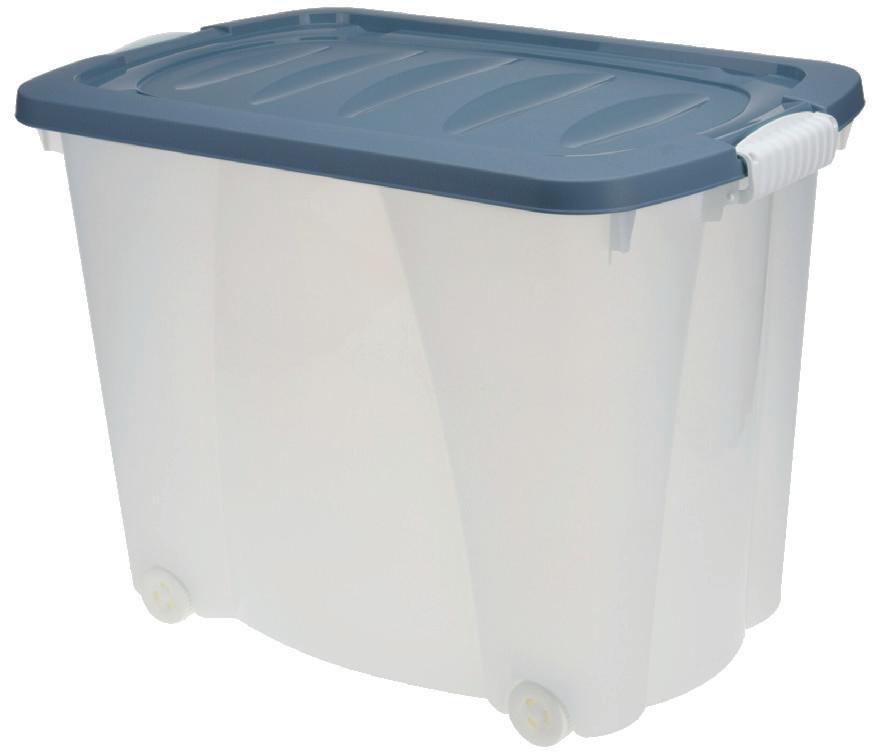 En PVC, plusieurs coloris, 2,49 e en 4,5 L, 30 x 20 x 15 cm, 4,99 e en 20 L, 43 x 33 x 24 cm et 9,99 e en dessous de lit 32 L avec roues, 30 x 20 x 15 cm.