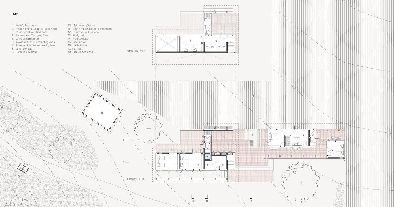 Our proposal for a new Jorejick residence, sited directly alongside the family's existing huts, creates a productive and communal threshold between the site's existing livestock corrals, agricultural croplands, latrine, and elder brother Nico's house. In addition to facilitating an open and familial relationship with the site's other structures, the NorthSouth orientation of the new building masses maximize Easterly cross-ventilation and allow for deep and comfortably shaded, inhabitable porticos. The design is organized into three distinct volumes, tied together by communal courtyards centered around the site’s existing Acacia trees. At the heart of the scheme is an indoor-outdoor kitchen and gathering area, featuring a foot pump-operated sink, a communal table, and a plein-air stove for the family to cook at during mealtimes and gather around throughout the day. The central volume is intended for the heads of the household to occupy, allowing them to care for both the family's aging matriarch, as well as their young grandchildren who are provided an en-suite sleeping niche. The south volume is intended for the youngest children, as it places them in close proximity to their parents, while simultaneously offering an intermediate stage of independence. The north volume houses the family’s school-age children, and contains an additional study space in the upper story loft. This spatial arrangement is intended to remain flexible as the family continues to grow.