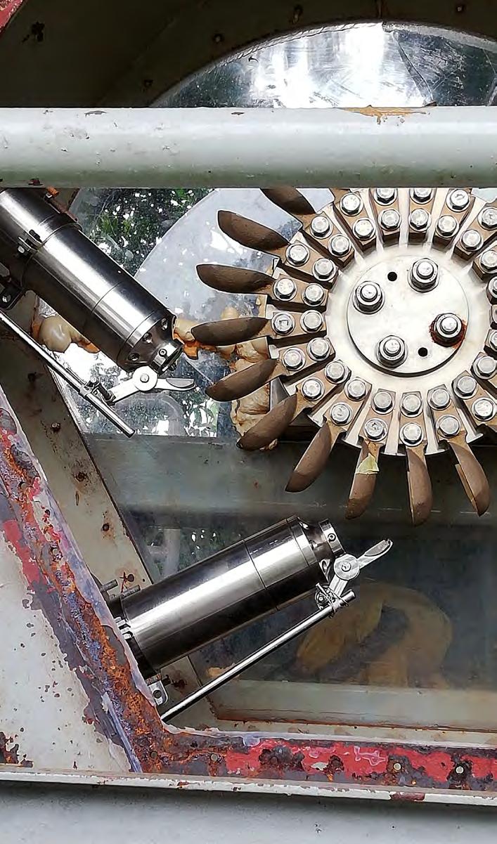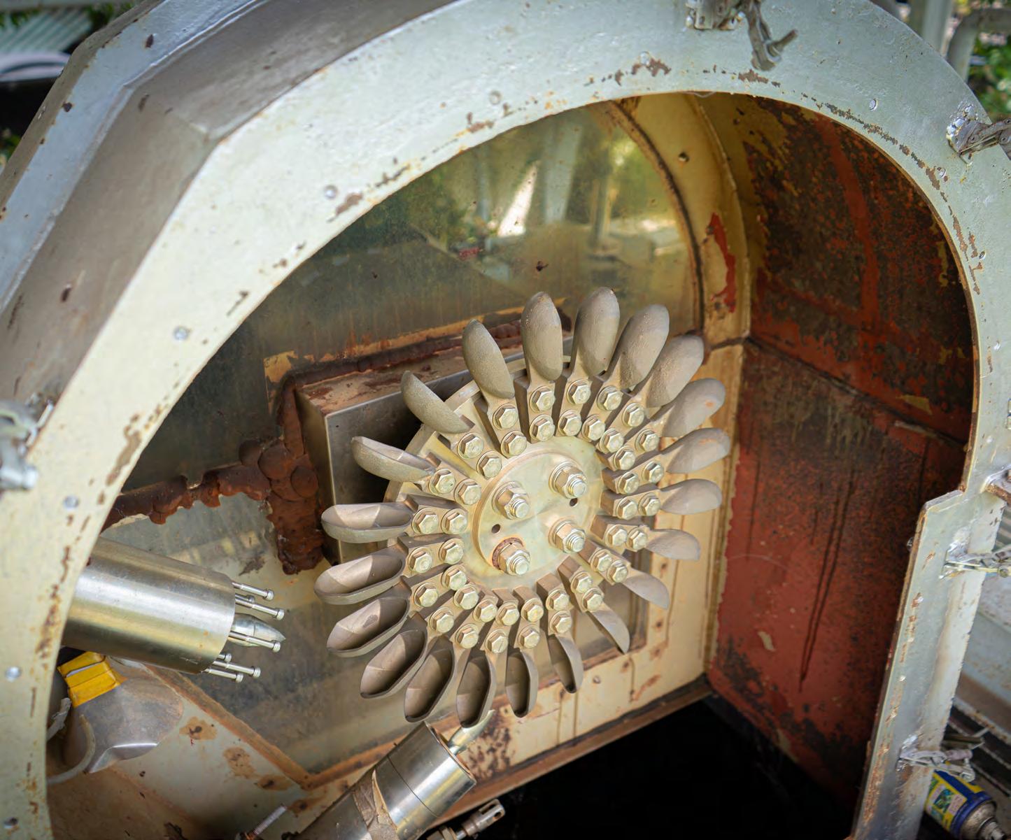 The smaller buckets make the turbine about 30% lighter than the Pelton counterpart.