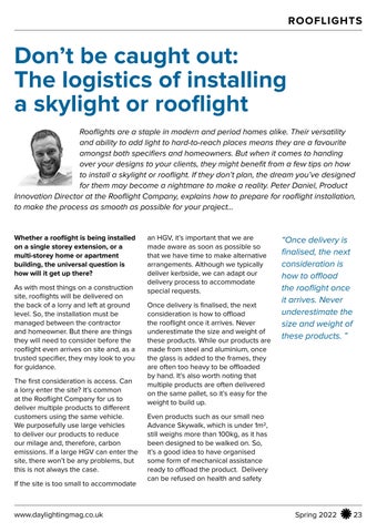 “Once delivery is finalised, the next consideration is how to offload the rooflight once it arrives. Never underestimate the size and weight of these products. ”