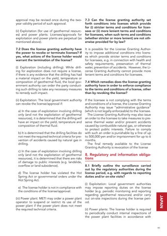 It is possible for the License Granting Authority to impose additional conditions into licenses which provide stricter terms and conditions for licensees, e.g. in connection with health and safety requirements, preservation of thermal water, prevention of accidents. However, the License Granting Authority cannot provide more lenient terms and conditions for licensees. 7.4 Which remedies does the license granting authority have in order to enforce compliance to the terms and conditions of a license, other than by revoking the license? If the licensee is not complying with the terms and conditions of a license, the License Granting Authority may issue “administrative guidance� (which is not legally enforceable) to the licensee. The License Granting Authority may also issue an order to the licensee to take measures to preserve thermal water and/or prevent accidents caused by combustible natural gas, or otherwise to protect public interests. Failure to comply with such an order is punishable by a fine of up to 500,000 yen and/or imprisonment for up to 6 months. The final remedy available to the License Granting Authority is revocation of the license
