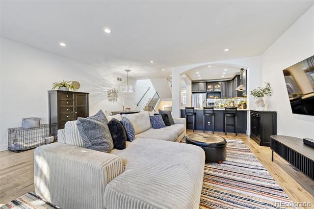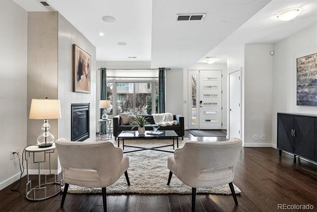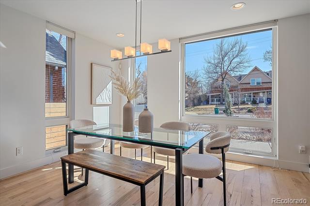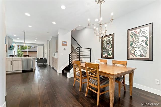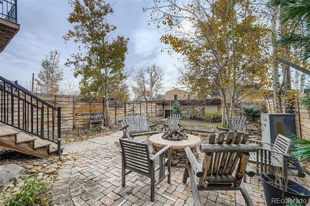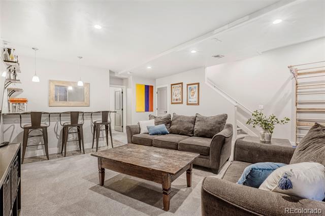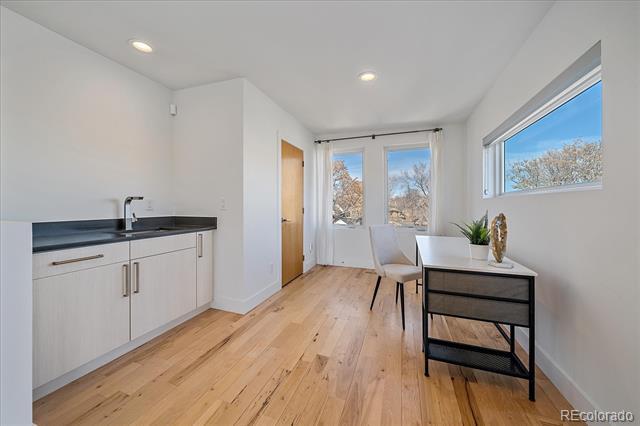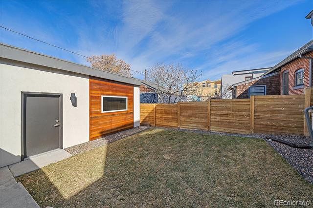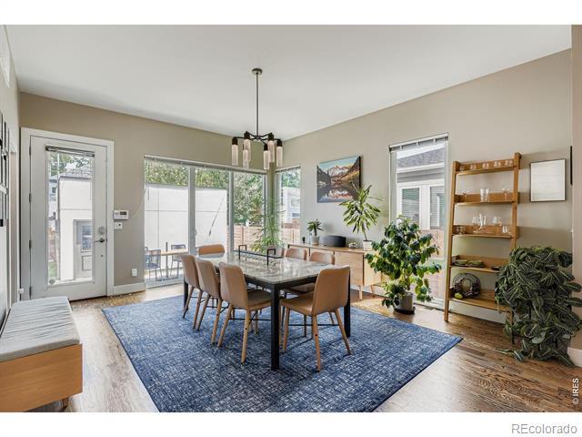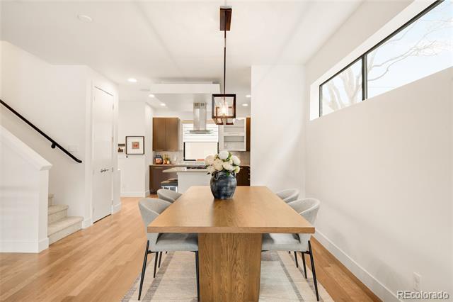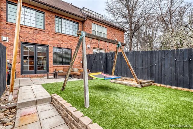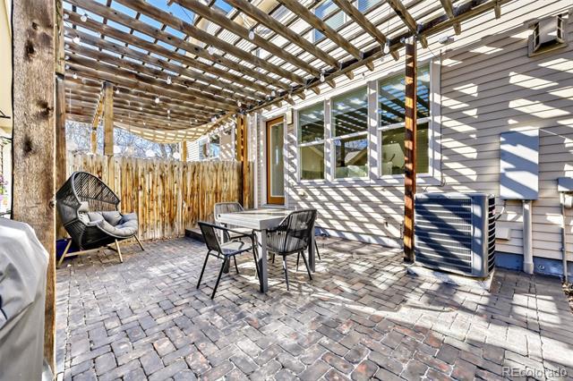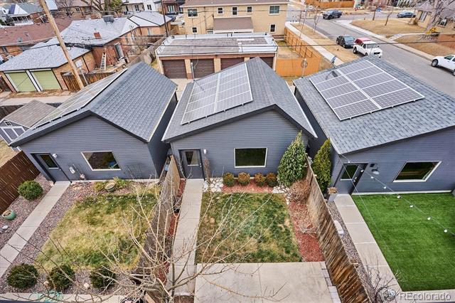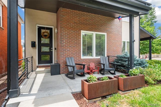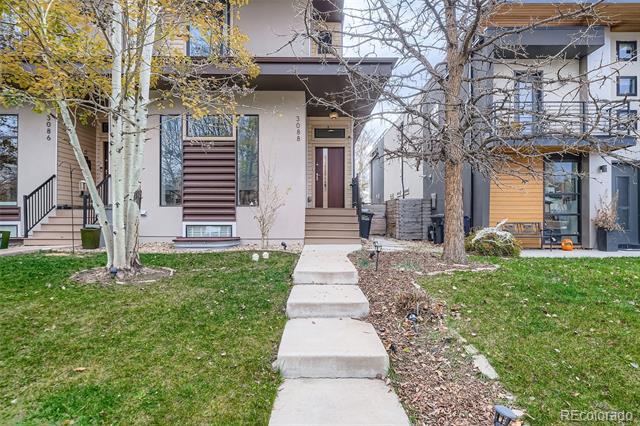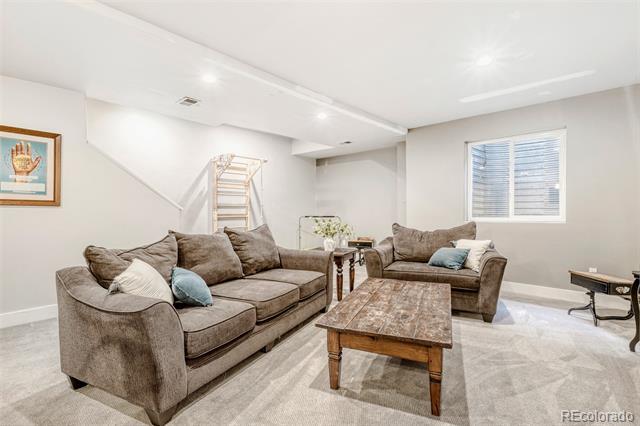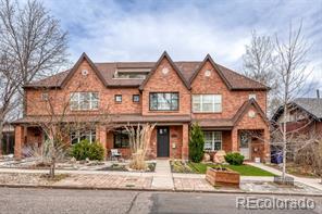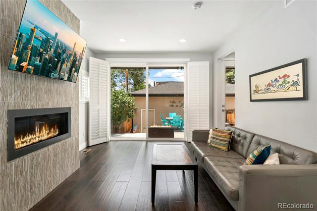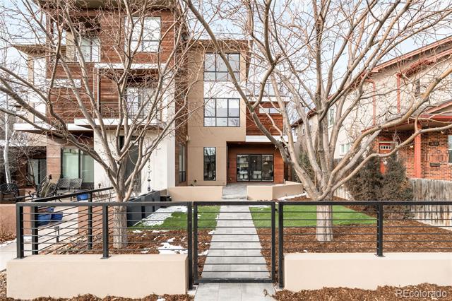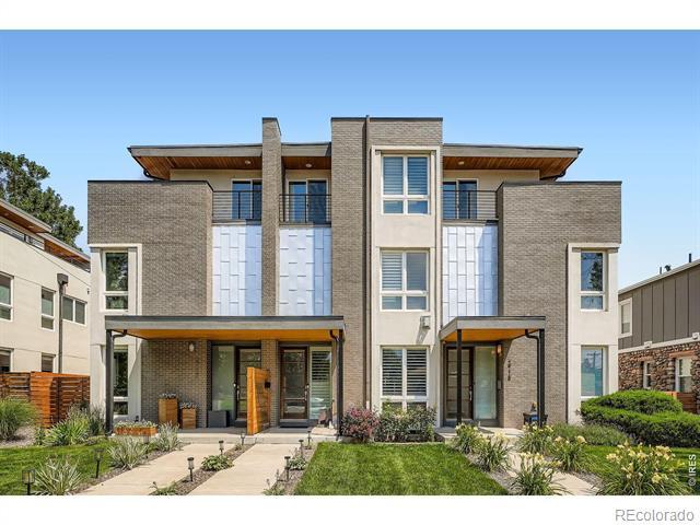 Beautifully designed 3000 sq ft townhome blocks from Sloans Lake, offering the perfect blend of space, light, and location. This thoughtfully built home lives large with an open floor plan, soaring ceilings, and abundant natural light from the many windows and skylights. The gourmet kitchen features granite countertops, custom wood cabinetry, Frigidaire appliances, and a generous breakfast bar, along with a dining area ideal for casual meals and gatherings. The spacious living room with gas log fireplace opens directly to a private, pergola-covered patio, perfect for outdoor dining and relaxing. Upstairs, the luxurious primary suite impresses with vaulted ceilings, French doors, and a spa-inspired five-piece bath with jetted tub, dual-head shower, custom double vanity, and separate water closet. All three upstairs bedrooms have vaulted ceilings, transom windows, and the upper level is brightened by skylights and new carpet throughout. The finished basement will surprise and delight with its unexpected 10 foot high ceilings, massive recreation area, and wet bar—perfect for entertaining. A private guest bedroom and full bath make the lower level ideal for visitors. The main level office with glass French doors works well as a work-from-home space or fifth bedroom. Hardwood floors run throughout the main level, while the basement features durable luxury vinyl plank flooring. Outside, enjoy a rare 2100 sq ft fenced astroturf common yard, perfect for corn hole or any outdoor gathering. You'll also find a sizeable shed, and an additional dedicated parking space. Located blocks from the vibrant Highland Square restaurant scene, minutes to downtown Denver, and within walking distance to award-winning Brown Elementary. One of only three thoughtfully built units with no HOA, offering solid construction, quiet living, and fantastic neighbors. An exceptional opportunity to own a very rare, spacious, light-filled home in one of Denver’s most sought-after locations.