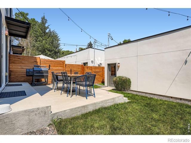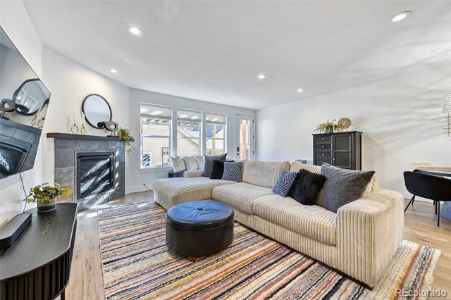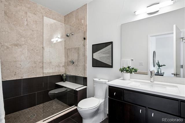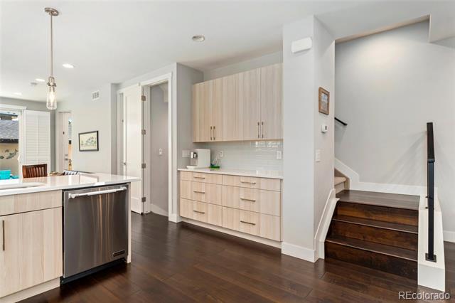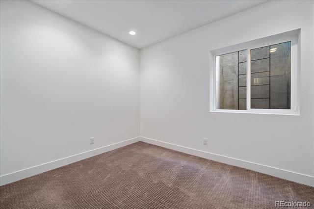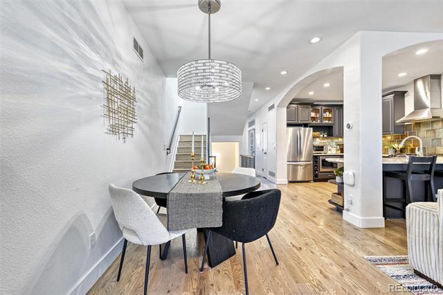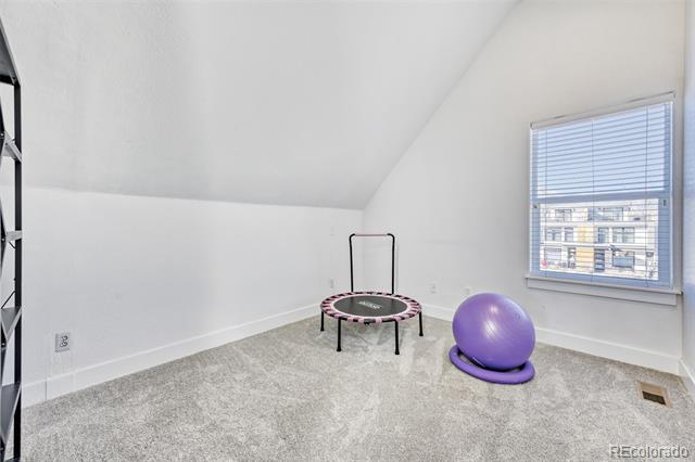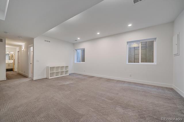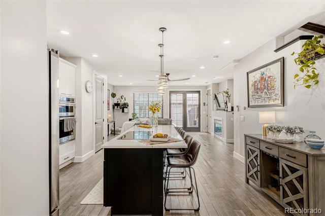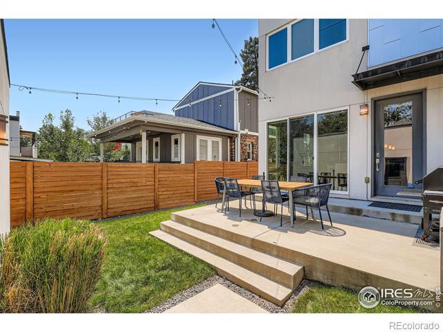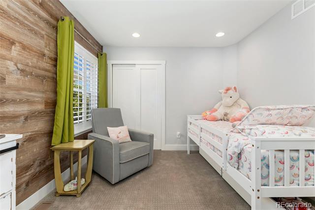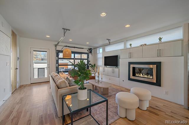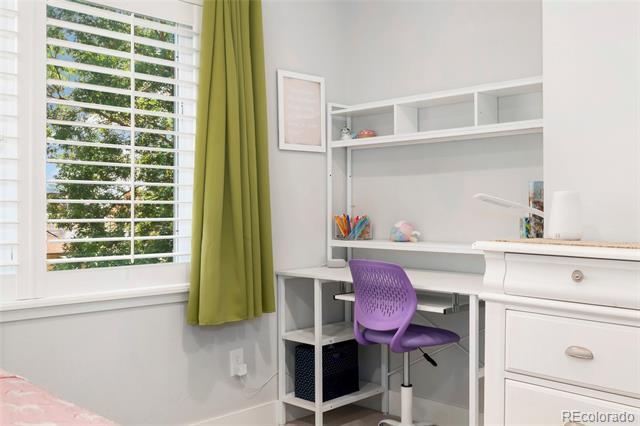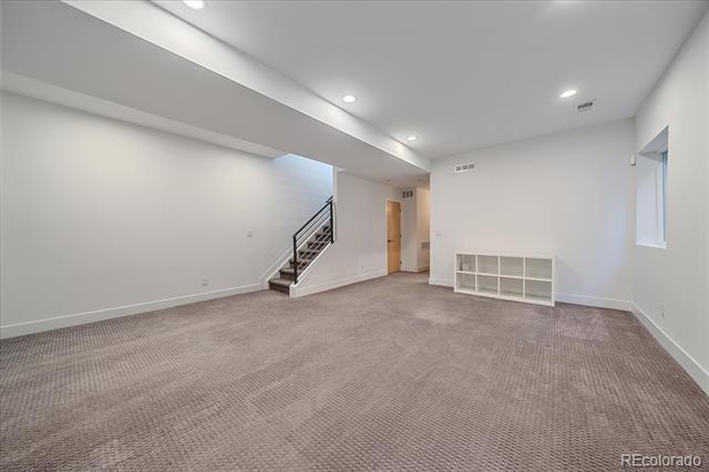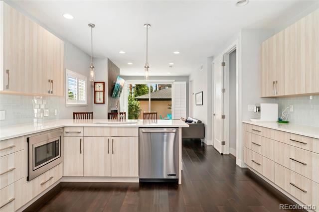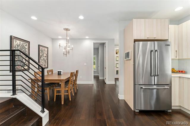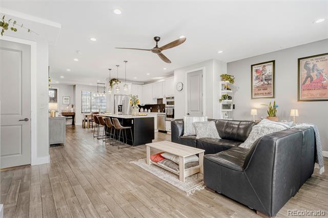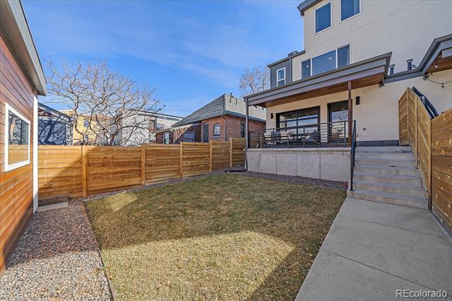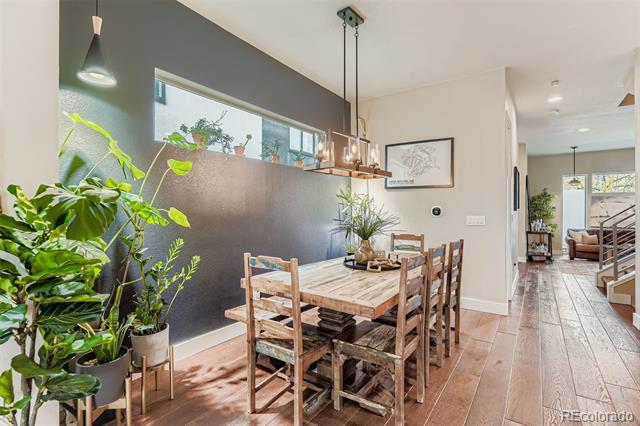Beautifully designed 3000 sq ft townhome blocks from Sloans Lake, offering the perfect blend of space, light, and location. This thoughtfully built home lives large with an open floor plan, soaring ceilings, and abundant natural light from the many windows and skylights. The gourmet kitchen features granite countertops, custom wood cabinetry, Frigidaire appliances, and a generous breakfast bar, along with a dining area ideal for casual meals and gatherings. The spacious living room with gas log fireplace opens directly to a private, pergola-covered patio, perfect for outdoor dining and relaxing. Upstairs, the luxurious primary suite impresses with vaulted ceilings, French doors, and a spa-inspired five-piece bath with jetted tub, dual-head shower, custom double vanity, and separate water closet. All three upstairs bedrooms have vaulted ceilings, transom windows, and the upper level is brightened by skylights and new carpet throughout. The finished basement will surprise and delight with its unexpected 10 foot high ceilings, massive recreation area, and wet bar—perfect for entertaining. A private guest bedroom and full bath make the lower level ideal for visitors. The main level office with glass French doors works well as a work-from-home space or fifth bedroom. Hardwood floors run throughout the main level, while the basement features durable luxury vinyl plank flooring. Outside, enjoy a rare 2100 sq ft fenced astroturf common yard, perfect for corn hole or any outdoor gathering. You'll also find a sizeable shed, and an additional dedicated parking space. Located blocks from the vibrant Highland Square restaurant scene, minutes to downtown Denver, and within walking distance to award-winning Brown Elementary. One of only three thoughtfully built units with no HOA, offering solid construction, quiet living, and fantastic neighbors. An exceptional opportunity to own a very rare, spacious, light-filled home in one of Denver’s most sought-after locations.