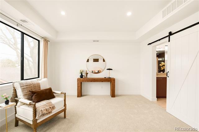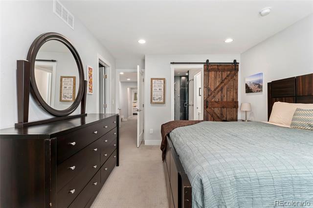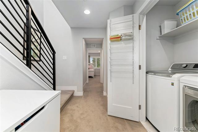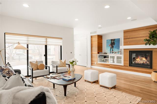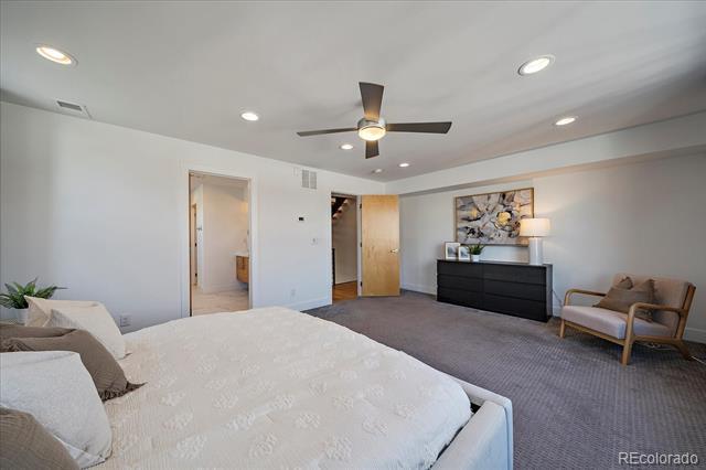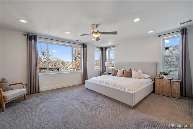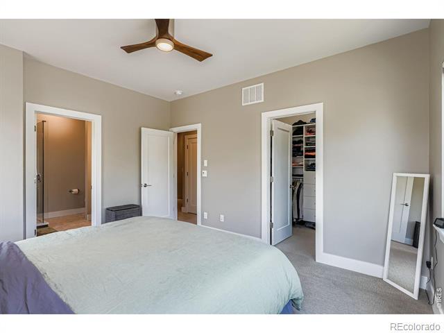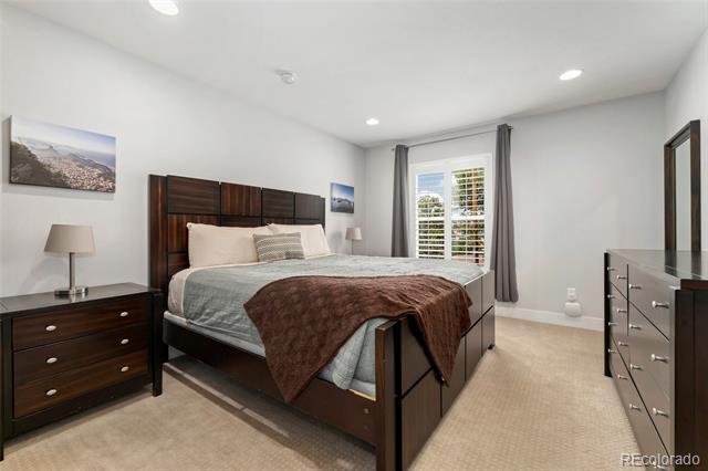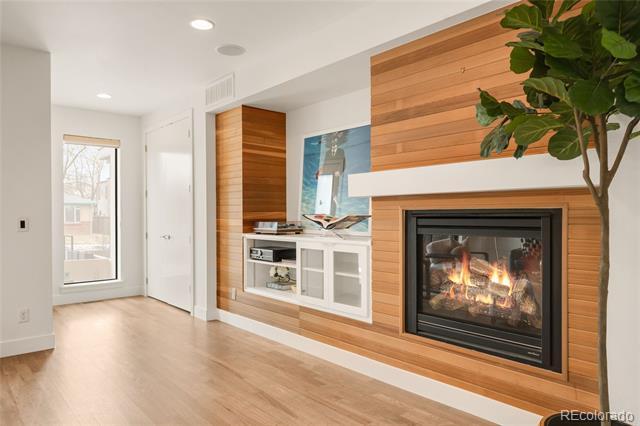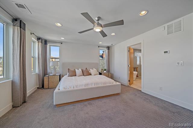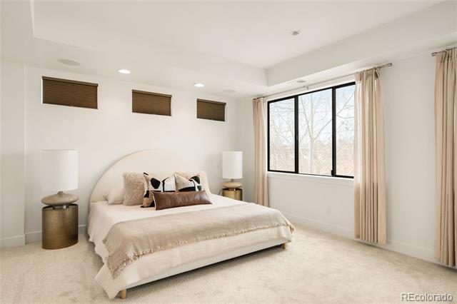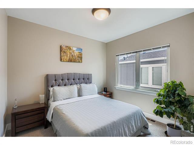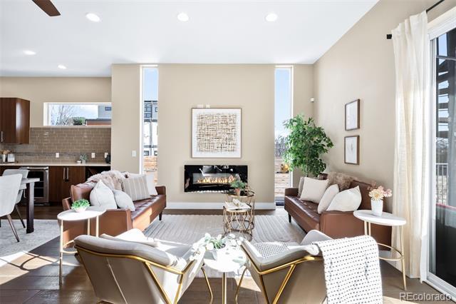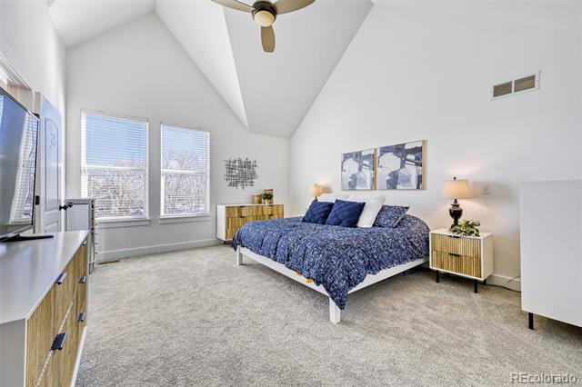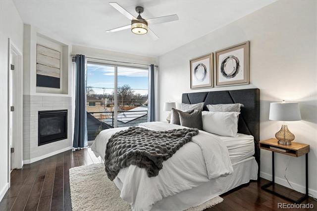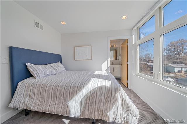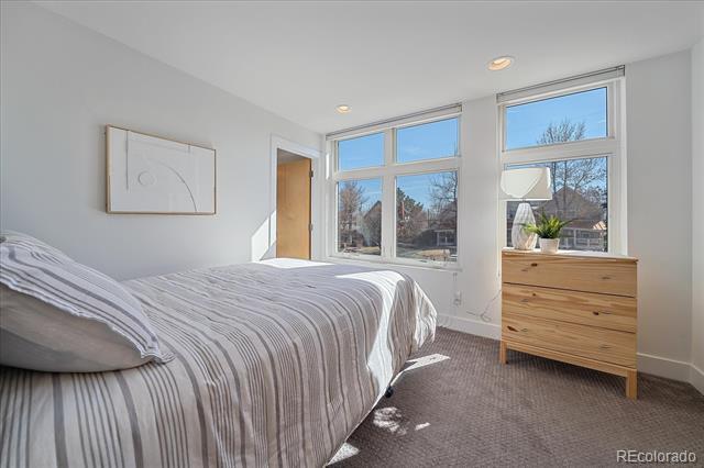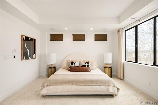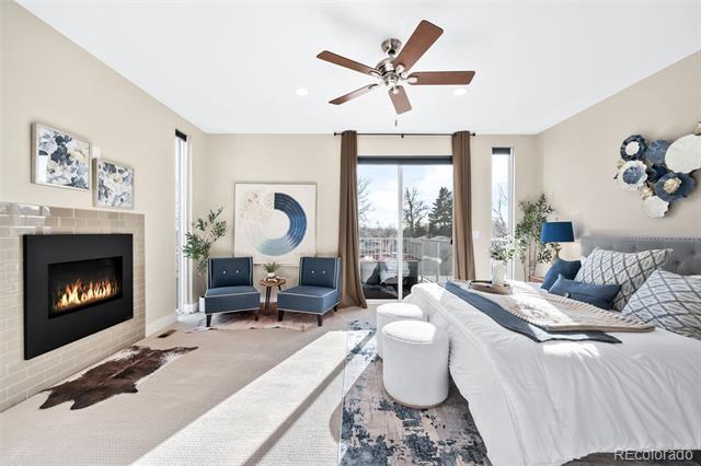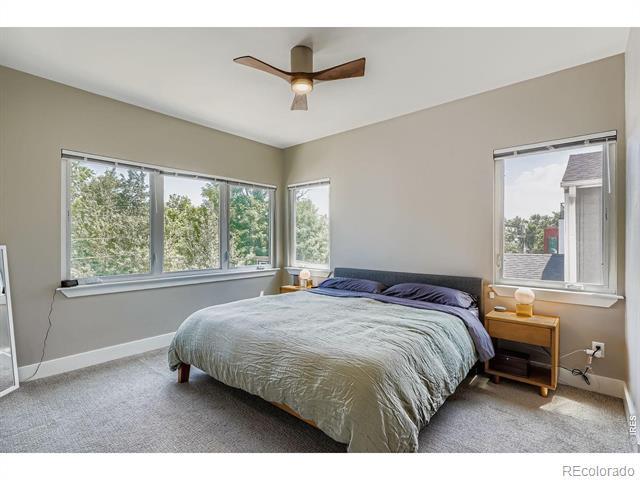 Exceptional, light-filled townhome in a premier Sloan’s Lake location that's less than one block to the lake and park. This stunning residence offers 3 bedrooms, 3.5 bathrooms, and 2,533 square feet of beautifully finished living space. Designed for seamless indoor-outdoor living, the home features a patio and yard off the kitchen, plus a large, private third-floor deck with a remote-controlled Sunsetter awning and big, breathtaking views of Sloan’s Lake and the mountains. A rare combination of privacy, quiet, and unforgettable sunsets. Each bedroom has its own bathroom (2 en-suites) and walk-in closet, and the luxurious primary suite includes a custom closet and a fireplace. Additional highlights include a secondfloor laundry room, two fireplaces (living room and primary bedroom), built-in speakers, a wet bar, two wine refrigerators, and a detached two-car garage wired for EV charging. Newly repainted and carpeted, this thoughtfully constructed home offers green-built features such as owned solar panels, extra insulation, newer high-capacity HVAC, and a HERS designation. Truly one of the finest townhomes available near Sloan’s Lake—this special property offers great condition, location, and price.