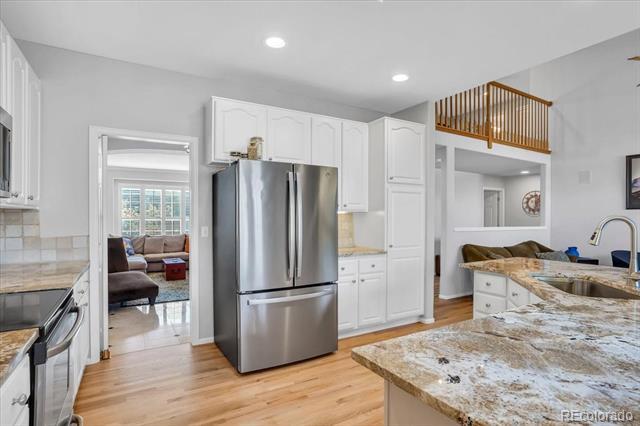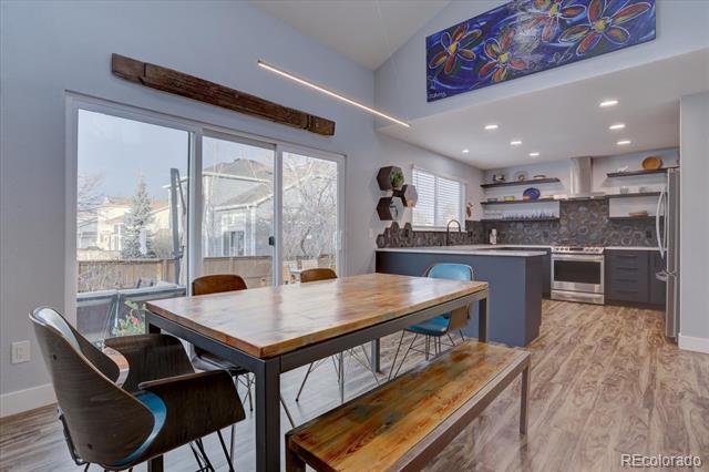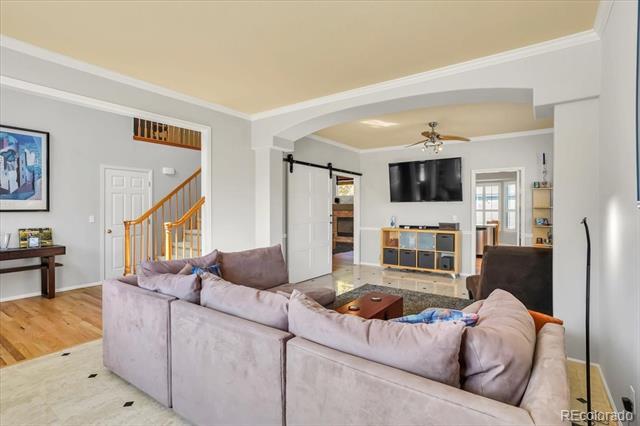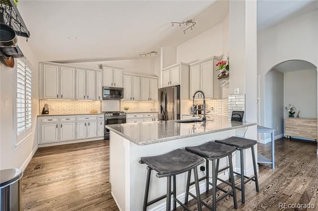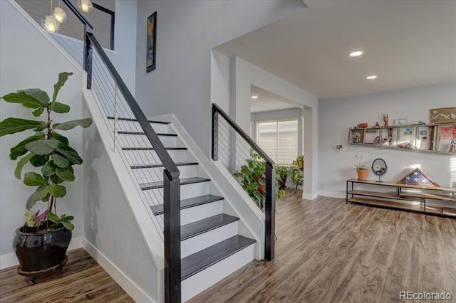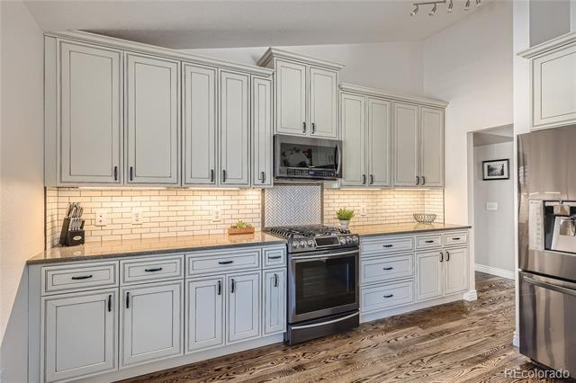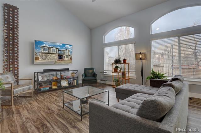 Stunning updated modern 6 bedroom, 4 bathroom south facing home in the heart of Highlands Ranch. So many updates! New banister with cable railings and hardwood stairs, completely remodeled kitchen with updated appliances, new oversized sliding glass door, all bathrooms remodeled, LVT flooring throughout upper two floors and in basement bathroom, all doors, door hardware, door trim, baseboard, window sills, new outlets and switches, all popcorn ceilings removed, LED light fixtures throughout, new countertop and sink in the laundry room, newly finished basement, new large concrete patio, with garden boxes with sprinklers, new landscaping in the front and back yard, new interior paint throughout the home and exterior trim paint, 220V outlet in garage for EV charging, and solar panels that are owned. Vaulted entry with new vertical lighting, formal living room and dining room (currently used as an office), kitchen with custom cabinets, upgraded Carrera quartz counters, undermount sink, floating shelves, dual fuel range, refrigerator included, vaulted kitchen eating area, large double-door pantry, vaulted family room, powder room, laundry room with sink, the washer, dryer, and hanging rack are included. Upstairs is a large vaulted master suite with room for a loveseat and media area, updated master bathroom with a super shower with a frameless glass enclosure, walk-in closet. The master is on one side of the home and there are 3 bedrooms and a full bathroom are on the other side of the home. The finished basement has a large rec room, exercise area flex space, 2 additional bedrooms, 3/4 bathroom. You will love the outdoor space, the large patio provides plenty of space to entertain. There are no homes immediately behind the home. Conveniently located near Highlands Ranch Town Center, shopping, and restaurants. Access to 4 amazing rec centers, trails, and open space. Don't miss the opportunity to make this your next home!