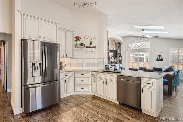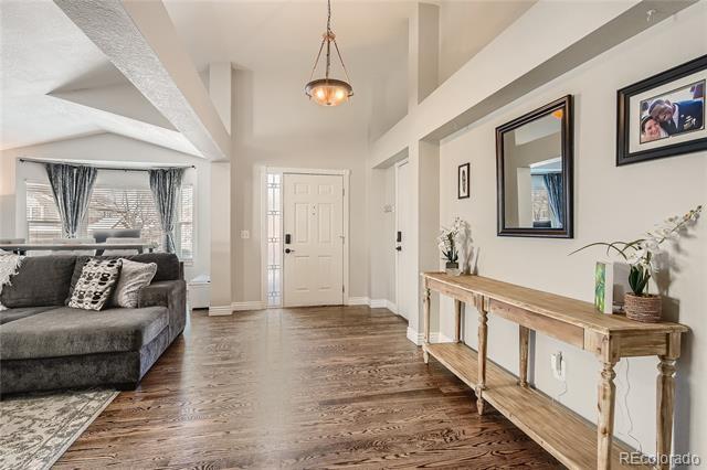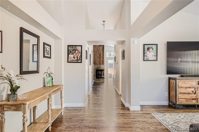 Brand new hot tub included! This beautifully remodeled ranch home in Highlands Ranch is not to be missed! The open floor plan offers tons of natural light & architectural elements. Walk in to the large formal living & dining area which offers plenty of possibilities. The custom kitchen includes graphite SS appliances, quartz countertops, soft close doors/drawers, 42in upper cabinets, tile backsplash, & vaulted ceiling. Off the kitchen is the family room with vaulted ceiling, a 2 sided gas fireplace with stone surround, skylight, built-ins, wood wall treatments, & a slider to the backyard. Double doors take you through to the primary bedroom which has high ceilings & a custom walk-in closet. The primary bathroom has been thoughtfully remodeled with a free standing soaking tub, large vanity with dual sinks, & floor to ceiling tile in the walk-in shower. Two additional bedrooms, a remodeled full bathroom, & a laundry closet with barn door complete the main level. The finished basement has a large family room with endless possibilities, a bedroom, storage area, and a large crawlspace. There's also a bathroom area with rough-in already in place. Enjoy the fully fenced back yard with an extended patio for outdoor living & entertaining. A concrete sidewalk along the side of the home makes for easy access in & out of the yard. Additional features of this home include: All new upgraded electrical panel, hot tub hook up, and 2 Electrical Vehicle charging outlets in the garage, all done in 2022. Newer exterior paint, whole house water filter system and humidifier, plantation shutters, finished two car garage, newly finished hardwood flooring, fresh interior paint, newer extended front concrete patio, radon mitigation system, two ceiling fans, designer lighting, & custom tile work. Home Warranty of 1+ year is transferable. Security system paid off and included. Located near shopping, rec centers, Town Center, library, great restaurants, & C-470 access.
