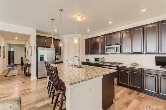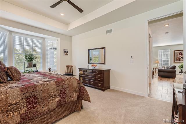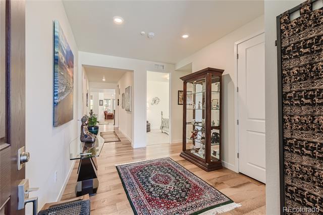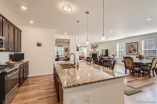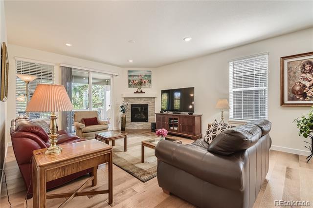 Beautiful 1 Year New Home in Heritage Todd Creek - Active Adult Golf Course Community. This 3 Bedroom, 1 Office, 3 Bath Ascott Model home is full of upgrades from Granite/Quartz Countertops throughout and Engineered High-end Hardwood Floors, California Closets in bedrooms / Mudroom, whole home Humidifier and Extended Covered Backyard Trex Deck. Spacious Open Floor-plan includes a great room of kitchen/dining room/family room/gas fireplace that leads out to the extended 25x11.5 back deck. Designer kitchen comes wood cabinets, Granite Island and Countertop, Gas Stove with GE Appliances. The nearby spacious office is entered through French doors and overlooks the extended patio. Large Master Bedroom/Bathroom Retreat with dual vanities Granite Countertop, Oversized Shower with floor to ceiling tile work, and upgraded Walk-In California Closet. Two additional main floor Bedrooms with full bath are perfect for out-of-town guests or an additional office. Property includes a Tandem 3 Car Garage to store vehicles, golf cart, bikes and other toys. Mudroom comes with upgraded storage cabinets and sink. Downstairs is an unfinished garden level basement that is plumbed for bathroom. Yard is professionally landscaped for low maintenance with irrigation system installed. Only blocks away from the Clubhouse that offers the perfect place to make friends in the 2 Pools and hot tub, workout facility, game and club rooms, library, billiards, restaurant, fitness classes, golf course, tennis, and pickle ball courts. Yes, its resort living in a friendly neighborhood community