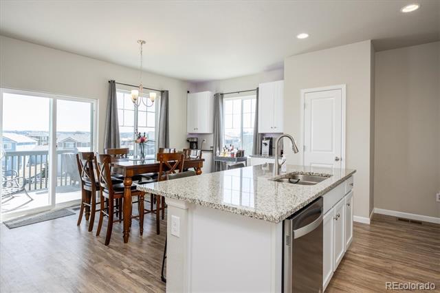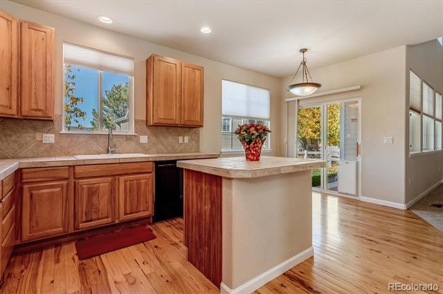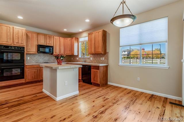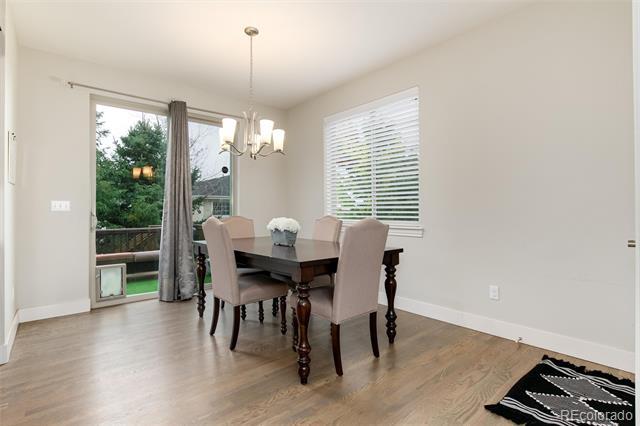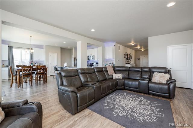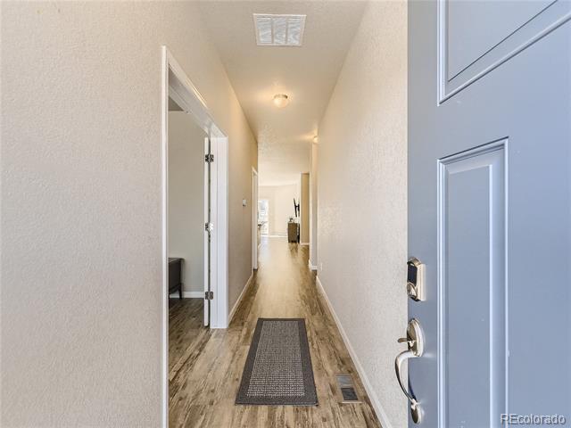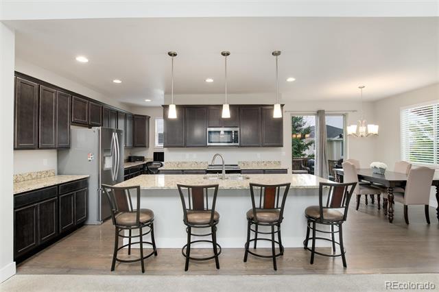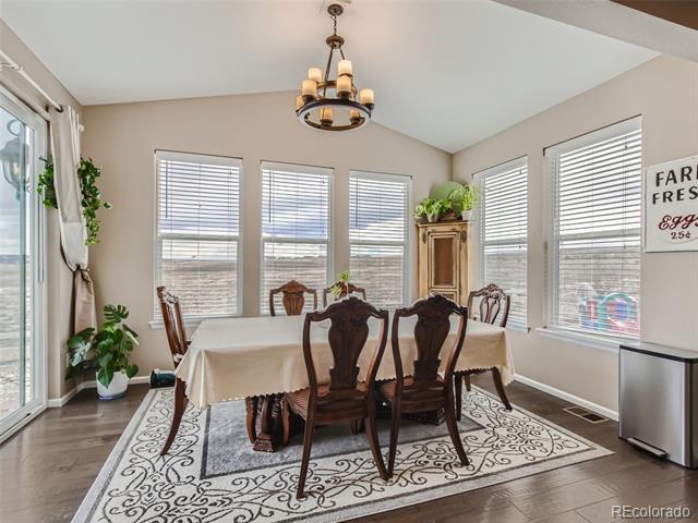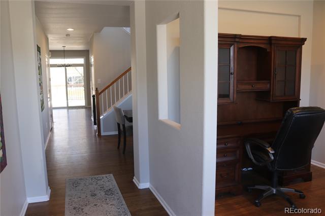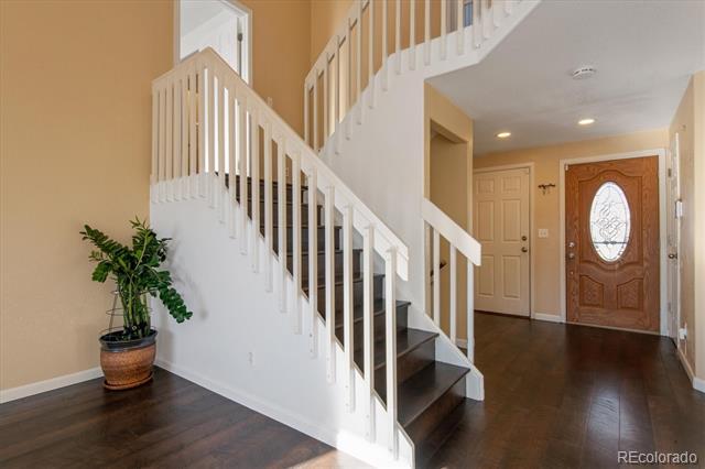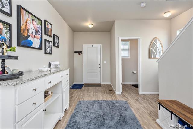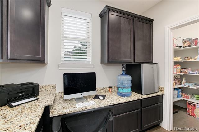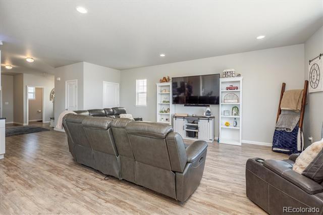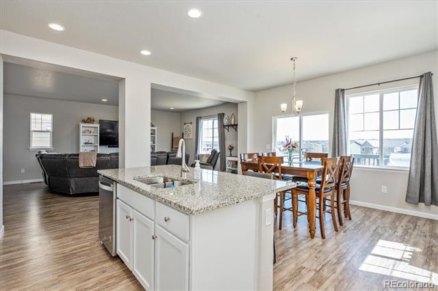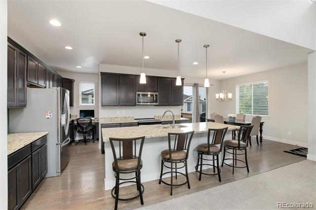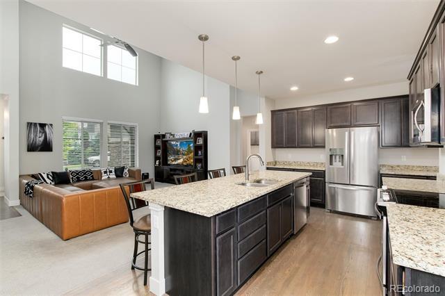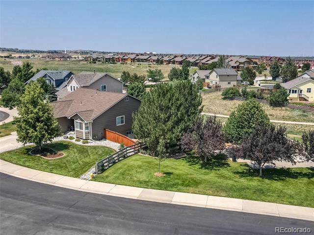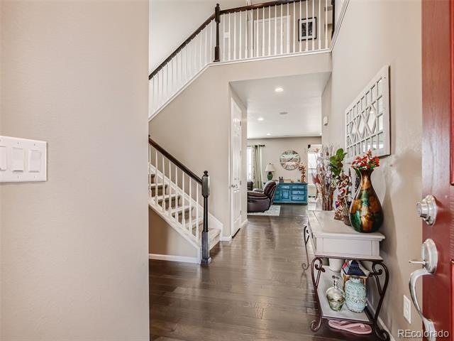 Five years new gorgeous home welcomes you with two-story volume ceilings in the great room and plenty of natural light. Site finished hardwood floors lend a classic elegance with contemporary grayed stain which compliments the espresso maple cabinets with soft-close hinges. The kitchen boasts a large granite topped island and double stainless sink. 42" upper cabinets wrap the entire room and wrap behind to provide a work desk area and window for natural light and walk-in pantry. The main floor primary suite includes an ensuite with barn door access and walk-in closet along with laundry. Upstairs a large bonus loft area is a second family room along with three additional bedrooms and full bath with tub/shower. Each room has great views of Parker and rolling hills. Off the dining area is a deck of synthetic weathershield decking and with stairs leading down to the fenced and landscaped back yard. The walk-out basement has plenty of windows, a sliding glass door and is plumbed for a future bath. Radon mitigation system is installed. Extensive gym equipment and mats are negotiable.