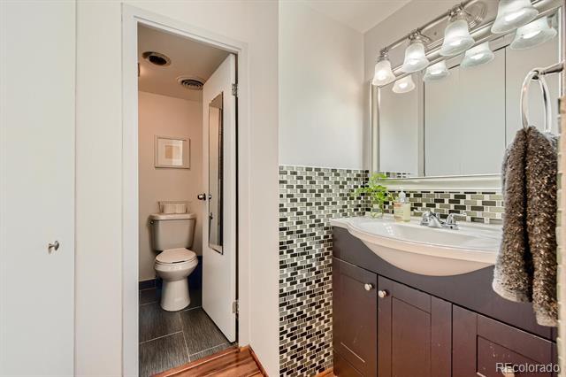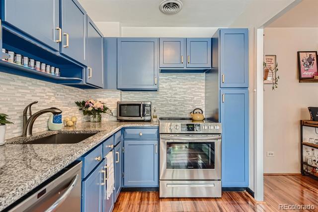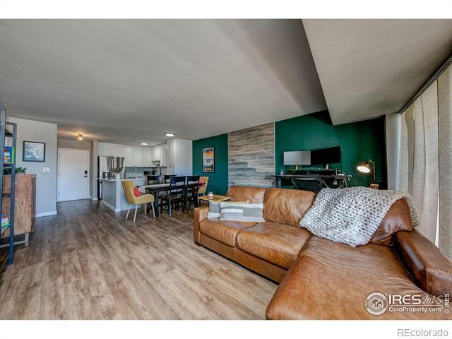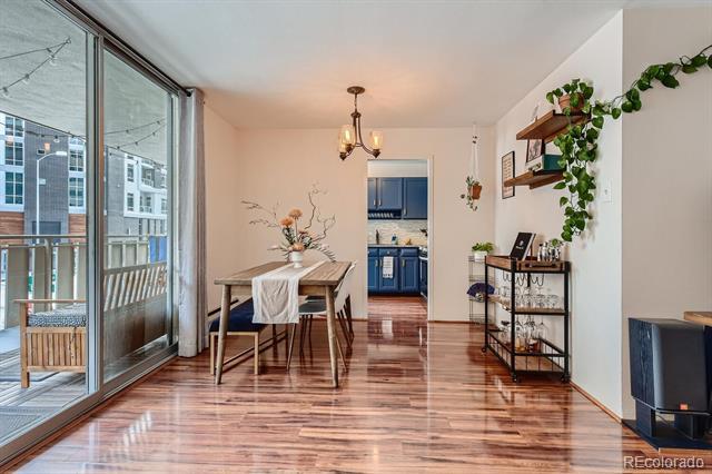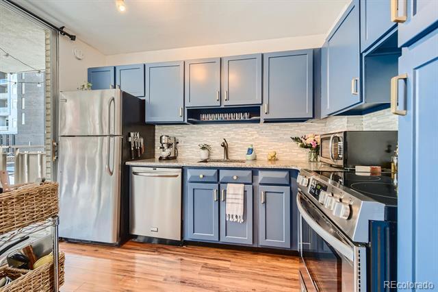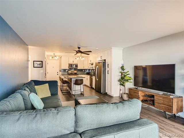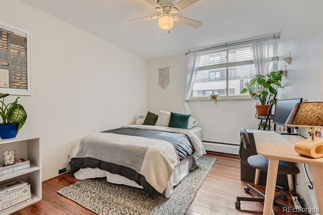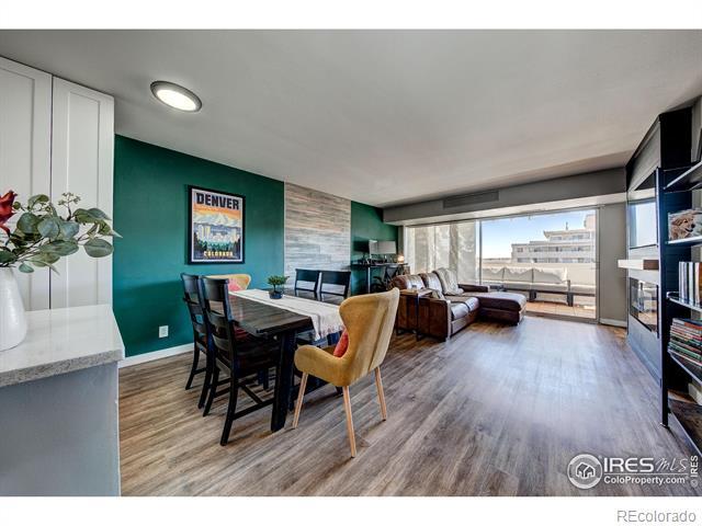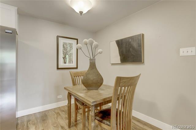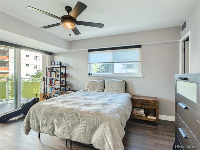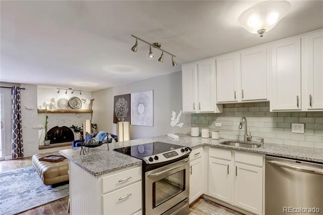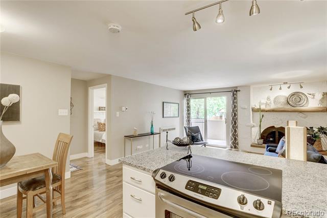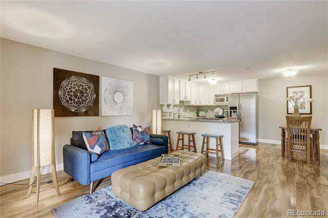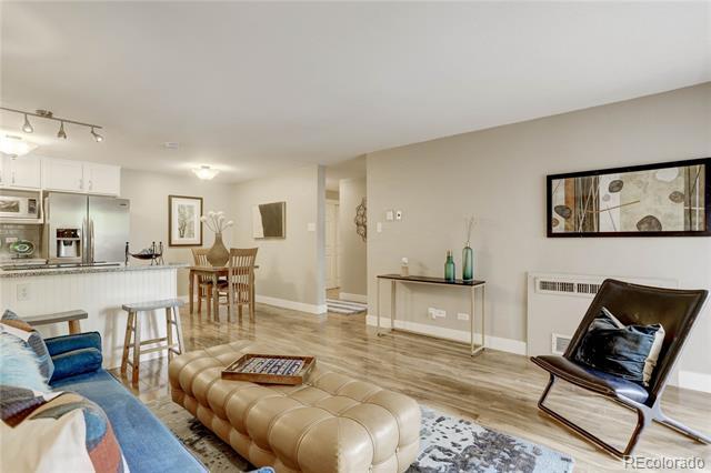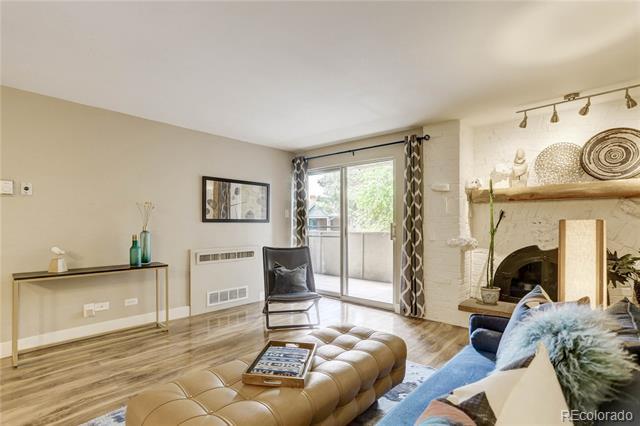 Open and remodeled condo in desirable Congress Park! This 2 bedroom, 1 bath unit has a remodeled kitchen featuring white cabinets, granite counters, and stainless steel appliances. The updated bathroom has newer Txtures and accent tile in the shower. Wide-planked Uooring throughout give the unit a highend feel. Wood burning Treplace in the living room adds to its coziness. The large covered balcony is perfect for enjoying your morning coSee or watching the sunset with friends. A hallway of closets provides ample storage space. Included with the unit is a storage room and deeded parking space. There is a shared laundry room on each Uoor. Building amenities include a pool, BBQ area, and secured entry. Only moments away from shopping, restaurants, movie theatre, City Park, Museum of Nature & Science, Denver Zoo, and everything the 9th & Colorado development has to oSer. Heat is included in HOA.
