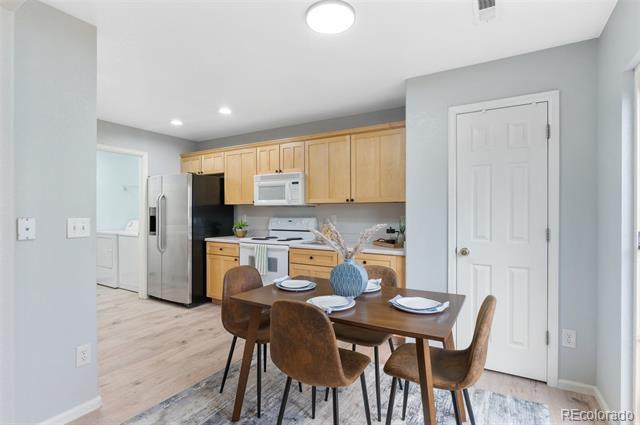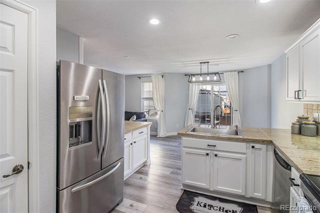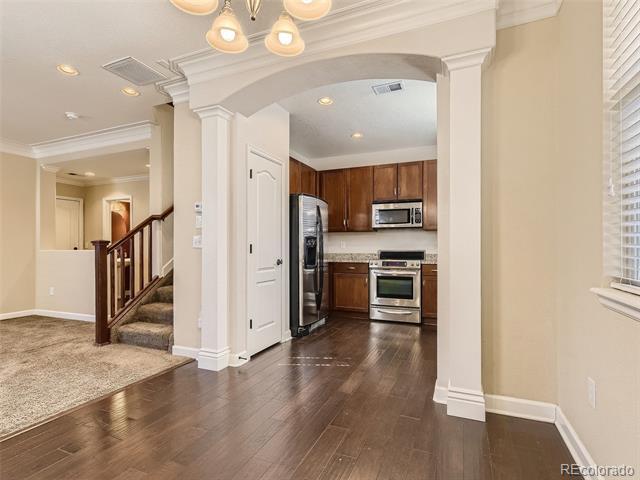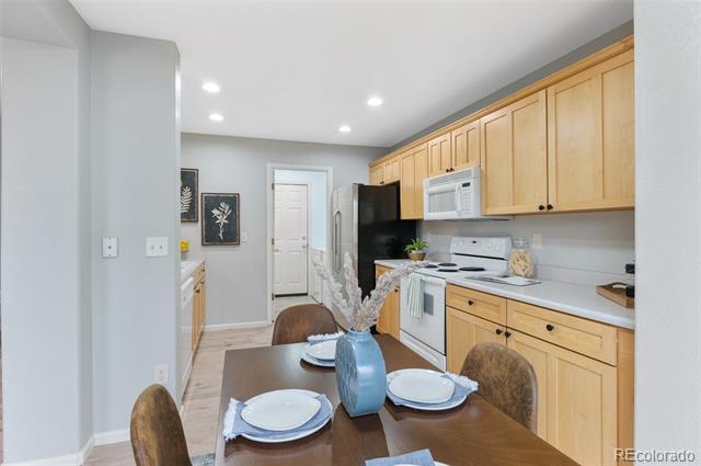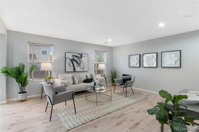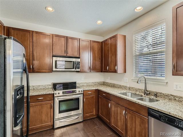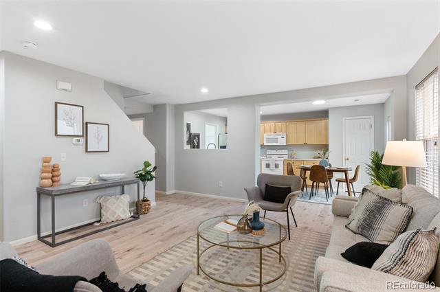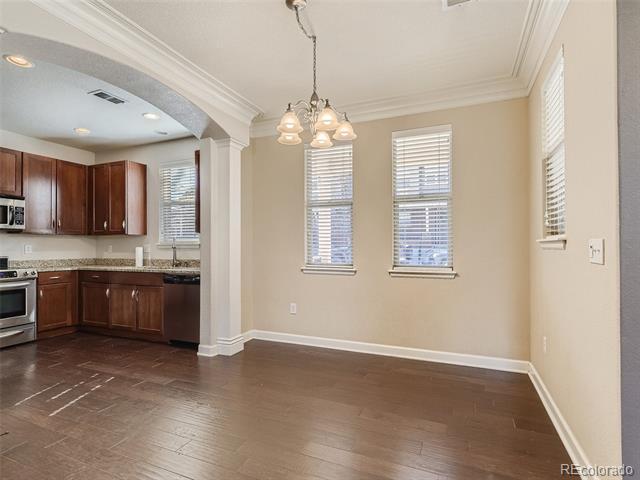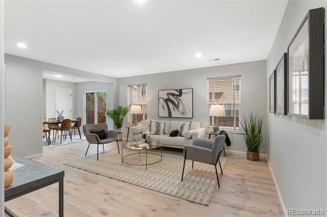Beauitful 3 bed/3 bath townhome in the highly desirable Southcreek neighborhood! This home is move in ready with elegant upgrades throughout including gorgeous wide plank walnut flooring and renovated bathrooms. The main floor has a spacious living room that is open to the kitchen and the dining area. The kitchen features newer stainless steel appliances, granite tile countertops and a pantry for extra storage. The easy flowing, open concept floorplan has tons of natural light from the large windows and truly feels like a single family home. Upstairs you'll find two secondary bedrooms, with spacious closets and an oversized primary bedroom, large enough to make a place for a home office if needed, which features an en-suite bathroom and his & her walk-in closets. Laundry room is conveniently located on the main level! The backyard features a concrete patio perfect for grilling/entertaining and tons of space to play, garden and enjoy all of Colorado's seasons. This home is in the Award-winning Cherry Creek School District! You are steps away from open space and trails . Easy access to E-470 and Parker Road, making commuting a breeze! Close to retail shopping , restaurants, RTD bus park 'n ride on Jordan and Lincoln! This One has it All! *Some furniture negotiable
