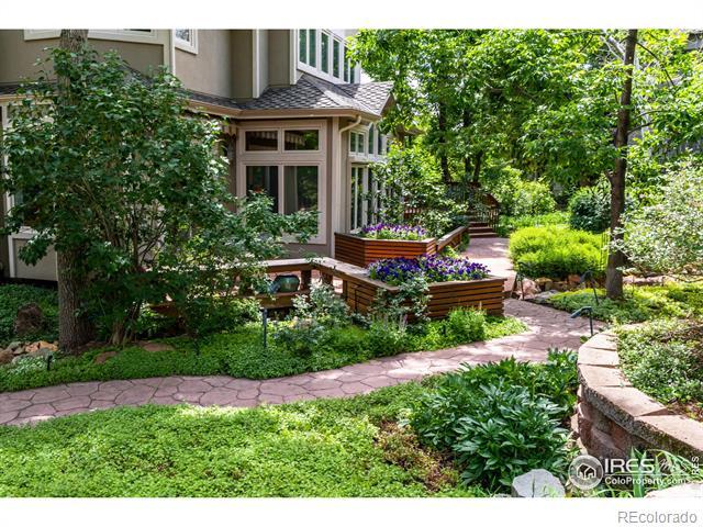 Beautiful Wonderland Hill home on a lush lot just steps from the lake and open space. Mature shade trees, beautiful gardens and professional landscape surround multiple outdoor sitting areas. Enjoy the sounds of seasonal Silver Lake Ditch babbling through the property. Open floorplan on the main level w/ hardwood floors throughout, vaulted living room w/ gas fireplace, dining room w/ deck access and study/office. Chef's kitchen w/ granite counters, Sub-Zero Refrigerator, Miele appliances including gas range & double ovens + breakfast nook opening to a private deck. Custom stained glass windows in living room, foyer and primary suite which also features vaulted ceilings, mountain views, 5 piece bath and huge walk-in closet. Spacious 2nd & 3rd bedrooms upstairs plus a cozy reading nook. Daylight basement includes 4th bedroom/office, spacious family room, full bathroom, large laundry room w/sink and craft room/gift wrapping station. The best of both worlds - well maintained home steps awa