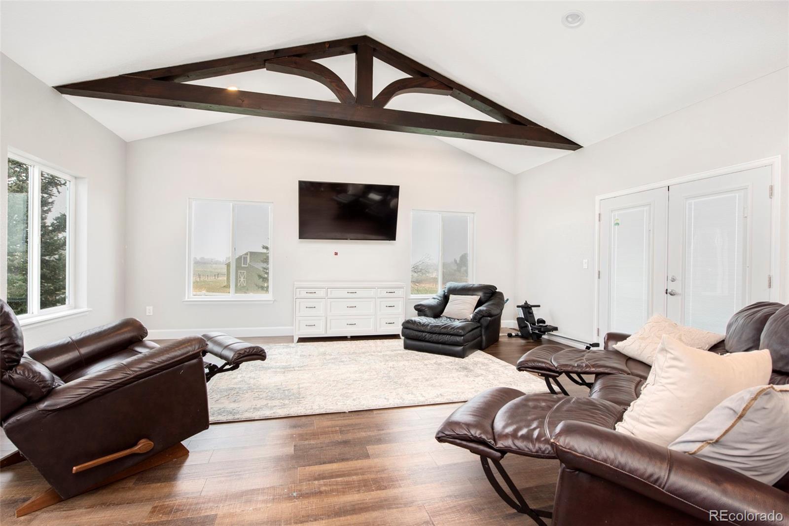 Spectacular Traditional TwoStory Home Horse Property in the Sought After Todd Creek Farms, This home has a lot to offer This home was meant for entertaining w/3 living areas.Its sits well on 1.89 acres of peace and tranquility w/an outbuilding for toys and is fully fenced. The kitchen boasts with Granite Counters,Custom Back Splash, Access to Patio, Pantry, SS Appliances, and Opens to the Family Room The Great room boasts Beautiful Architectural Beams Two Storage Closets and a Wall of Windows.The Primary Bedroom has Brand New Carpet, Decorative/Storage Nook, Private 5 Piece Bath w/Granite Counters, Lots of Natural Light, and Soaking Tub All Bedrooms have Brand New Carpet. The Basement has Two Bedrooms and a Full Bath.This backyard and Patio are unbelievable, Plenty of privacy, trees,and grassy area for outdoor activities.The 960 sq ft. outbuilding has a workshop, electricity, and can hold your toys.Also, 2 Separate 2 Car Garage.