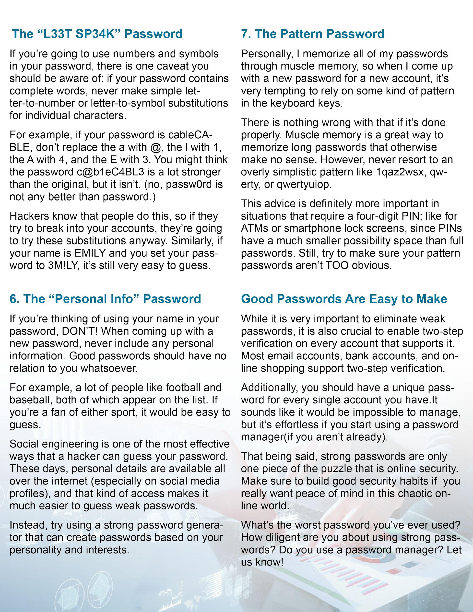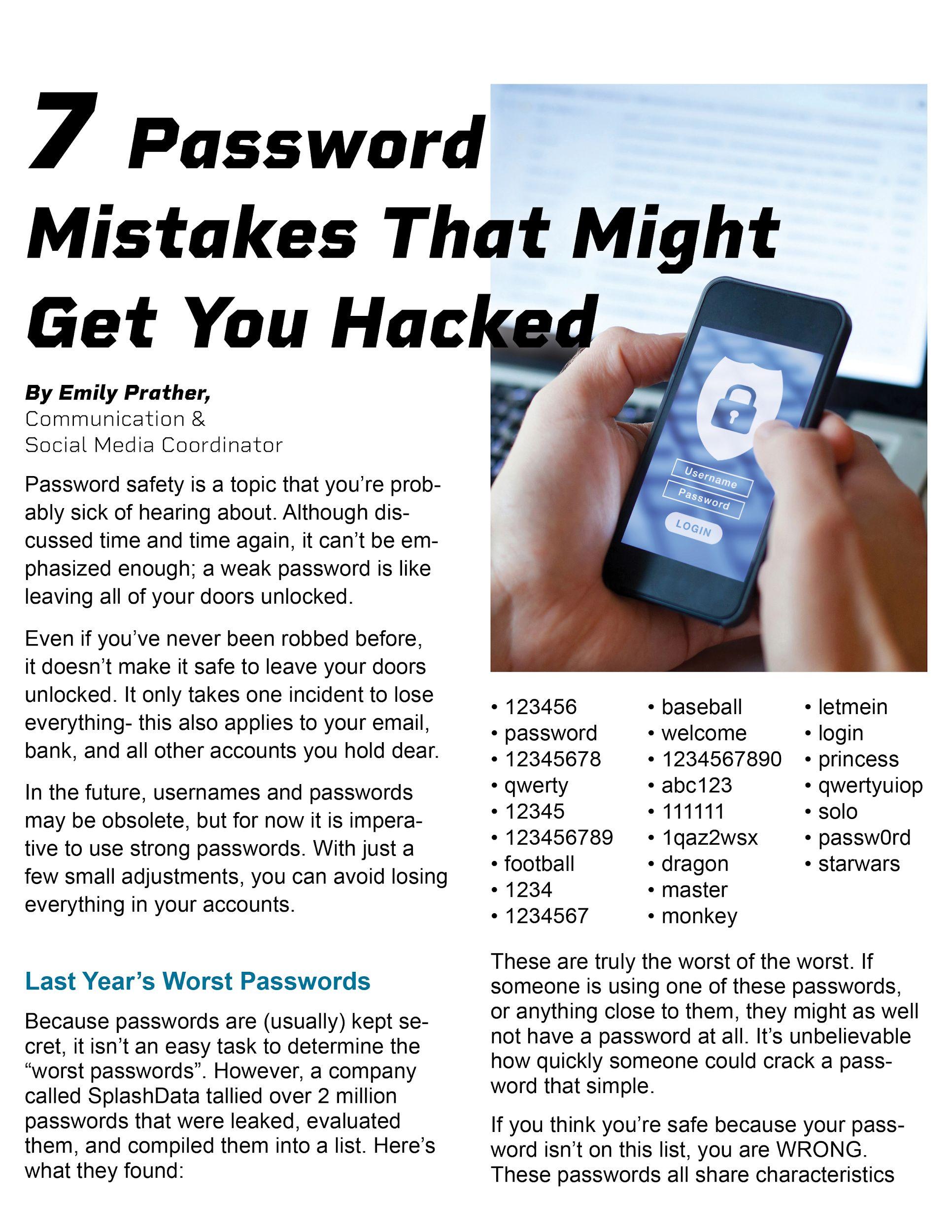 We can’t go anywhere without password security. On page 5 we feature the article “7 Password Mistakes That Might Get You Hacked.” Let us know what you learned in this article and will be implementing.