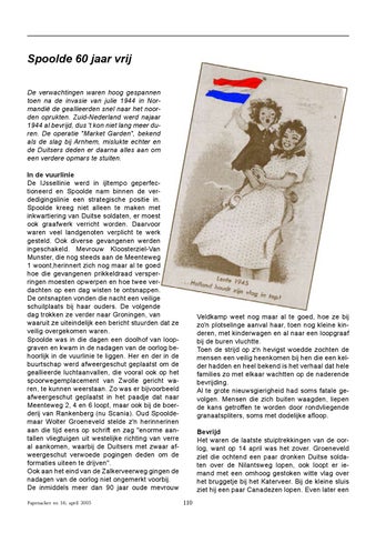 Veldkamp weet nog maar al te goed, hoe ze bij zo'n plotselinge aanval haar, toen nog kleine kinderen, met kinderwagen en al naar een loopgraaf bij de buren vluchtte. Toen de strijd op z'n hevigst woedde zochten de mensen een veilig heenkomen bij hen die een kelder hadden en heel bekend is het verhaal dat hele families zo met elkaar wachtten op de naderende bevrijding. Al te grote nieuwsgierigheid had soms fatale gevolgen. Mensen die zich buiten waagden, liepen de kans getroffen te worden door rondvliegende granaatspliters, soms met dodelijke afloop. Bevrijd Het waren de laatste stuiptrekkingen van de oorlog, want op 14 april was het zover. Groeneveld ziet die ochtend een paar dronken Duitse soldaten over de Nilantsweg lopen, ook loopt er iemand met een omhoog gestoken witte vlag over het bruggetje bij het Katerveer. Bij de kleine sluis ziet hij een paar Canadezen lopen. Even later een 110