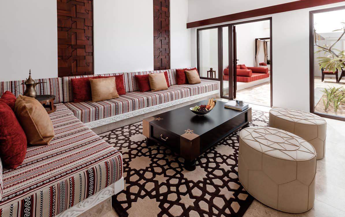 The bedroom carried the same low set majlis seating beside the king bed, looking out to the pool. A walk in closet held robes, a beach bag and other practical touches, while the marble bathroom came with a deep tub, a rain shower and simple bath salts and soaps. The blend of Omani materials and modern finishes gave the villa a unique touch. Look out for the beach volleyball and frisbee in the villa to take with you on the short walk to the private beach.