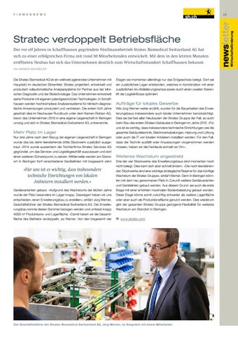 Mehr Platz im Lager Nur drei Jahre nach dem Bezug der eigenen Liegenschaft in Beringen wurde das bis dahin leerstehende dritte Stockwerk zusätzlich ausgebaut. 2014 wurde ausserdem die Tochterfirma Stratec Services AG gegründet, um das Service- und Logistikgeschäft auszubauen und dort einen weiteren Schwerpunkt zu setzen. Mittlerweile werden am Standort in Beringen fünf verschiedene Gerätelinien mit insgesamt zehn