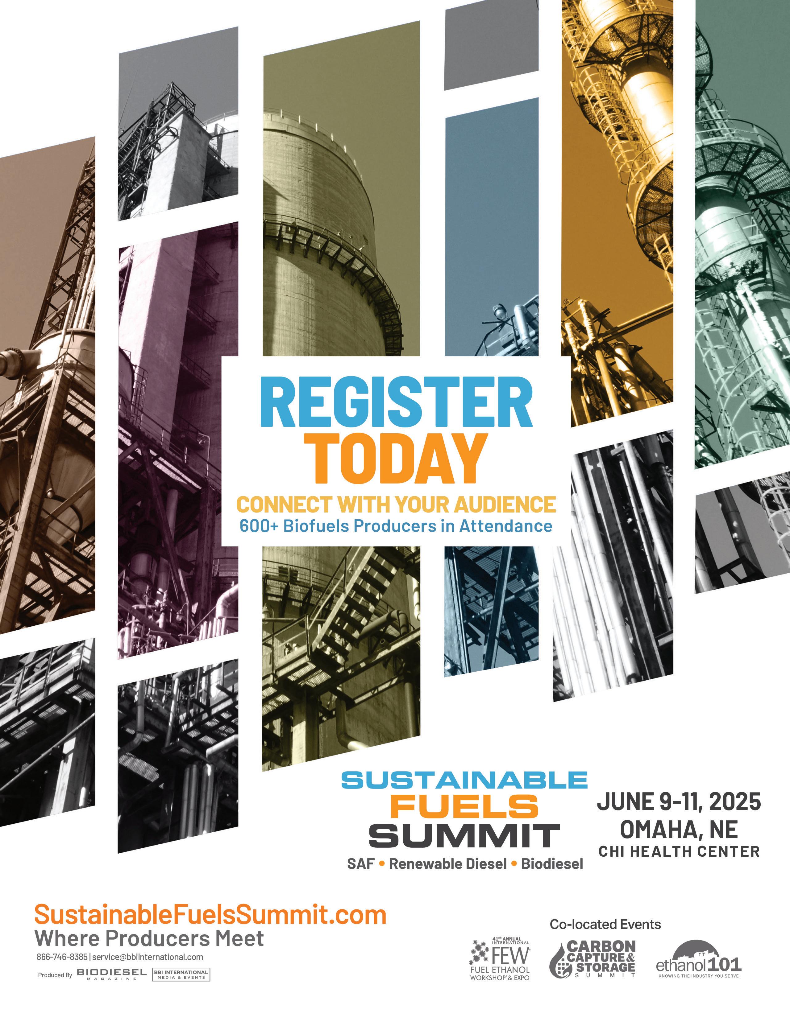 The Sustainable Fuels Summit: SAF, Renewable Diesel and Biodiesel is a premier forum designed for producers of biodiesel, renewable diesel, and sustainable aviation fuel (SAF) to learn about cuttingedge process technologies, innovative techniques, and equipment to optimize existing production. Attendees will discover efficiencies that save money while increasing throughput and fuel quality. Produced by Biodiesel Magazine and SAF Magazine, this worldclass event features premium content from technology providers, equipment vendors, consultants, engineers, and producers to advance discussions and foster an environment of collaboration and networking. Through engaging presentations, fruitful discussions and compelling exhibitions, the summit aims to push the biomass-based diesel sector beyond its current limitations. Co-located with the International Fuel Ethanol Workshop & Expo, the Sustainable Fuels Summit conveniently harnesses the full potential of the integrated biofuels industries while providing a laserlike focus on processing methods that deliver tangible advantages to producers. Registration is free of charge for all employees of current biodiesel, renewable diesel and SAF production facilities, from operators and maintenance personnel to board members and executives.