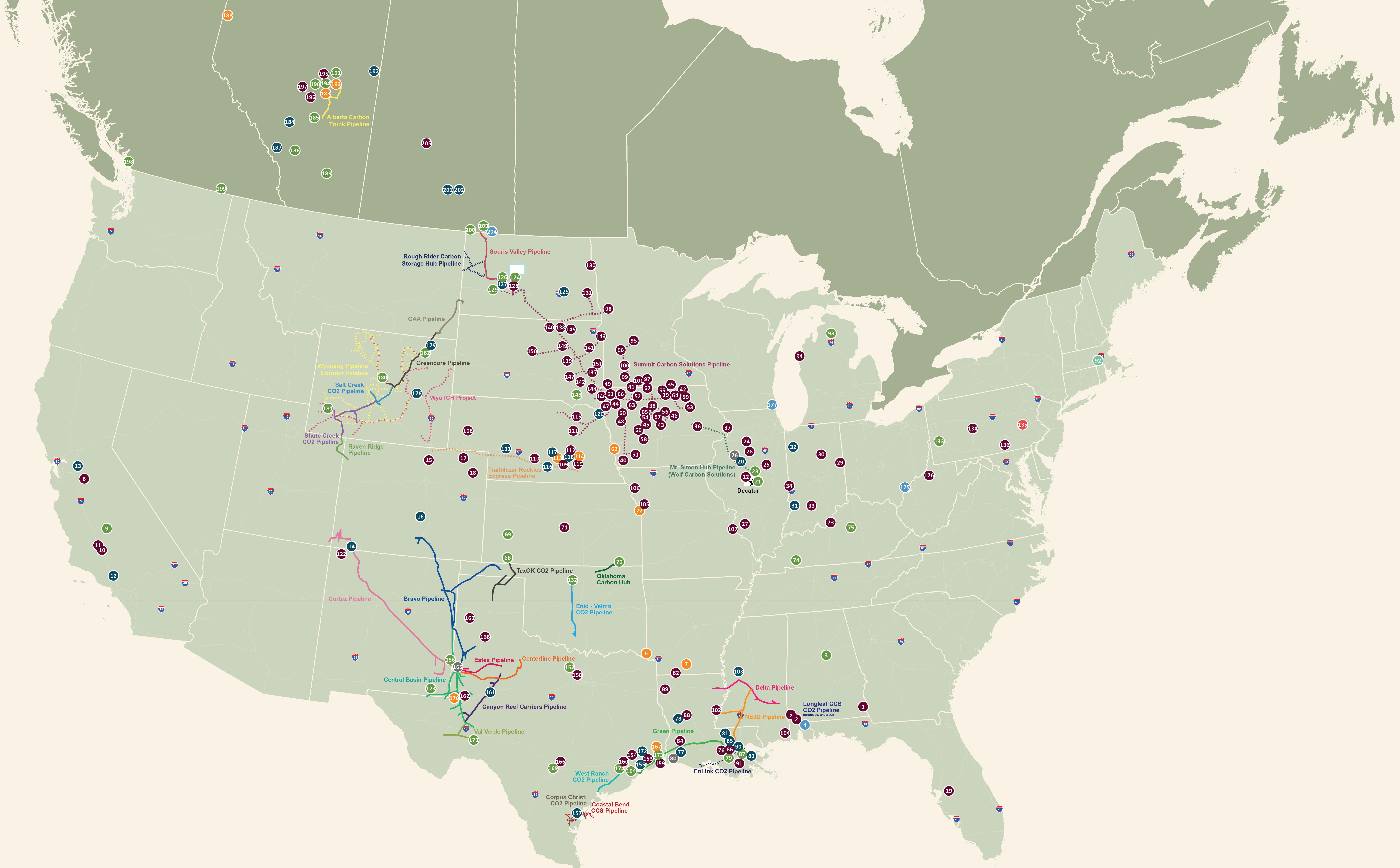 Facility Map will identify facilities currently or planning to capture and/or store carbon in the U.S. and Canada. Color coded for quick reference, the map indi-