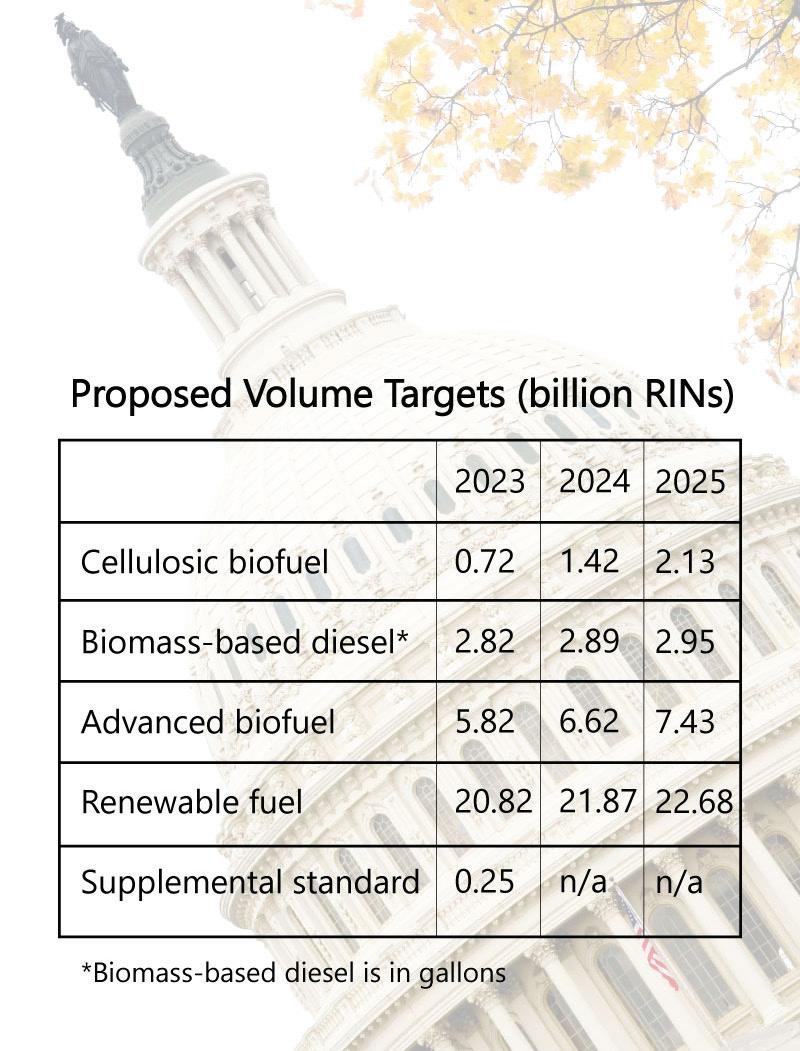 The U.S. EPA on Dec. 1 released its long-awaited Renewable Fuel Standard set rule, which includes renewable volume obligations (RVOs) for 2023, 2024 and 2025. The proposed rule expands the program beyond liquid fuels to include certain types of renewable electricity used to fuel cars. It sets the 2023, 2024 and 2025 RVOs at 20.82 billion gallons, 21.87 billion gallons and 22.68 billion gallons, respectively. For 2023, a 250-million-gallon supplemental obligation would also be imposed. The EPA has proposed to set the 2023 total RVO at 20.82 billion gallons, up 190 million gallons when compared to the 2022 RVO finalized earlier this year. The 2023 blend target includes the nested requirements of 720 million gallons of cellulosic fuel, 2.82 billion gallons of biomass-based diesel and 5.82 billion gallons of advanced biofuel. Conventional biofuels, such as corn ethanol, could fill up to 15 billion gallons of the RVO requirement. The 250-million-gallon supplemental obligation boosts the total 2023 obligation to 21.07 billion gallons. For 2024, the EPA is proposing to increase the total RVO by 1.05 billion gallons to 21.87 billion gallons, including 1.42 billion gallons of cellulosic biofuel, 2.89 billion gallons of biomass-based diesel, and 6.62 billion gallons of advanced biofuel. For 2025, the agency proposes to increase blend obligations by an additional 810 million gallons to 22.68 billion. The nested RVO would include 2.13 billion gallons of cellulosic biofuel, 2.95 billion gallons of biomass-based diesel, and 7.43 billion gallons of advanced biofuel. The volume of conventional biofuels that can be used to meet RFS blend requirements would be maintained at 15.25 billion gallons.