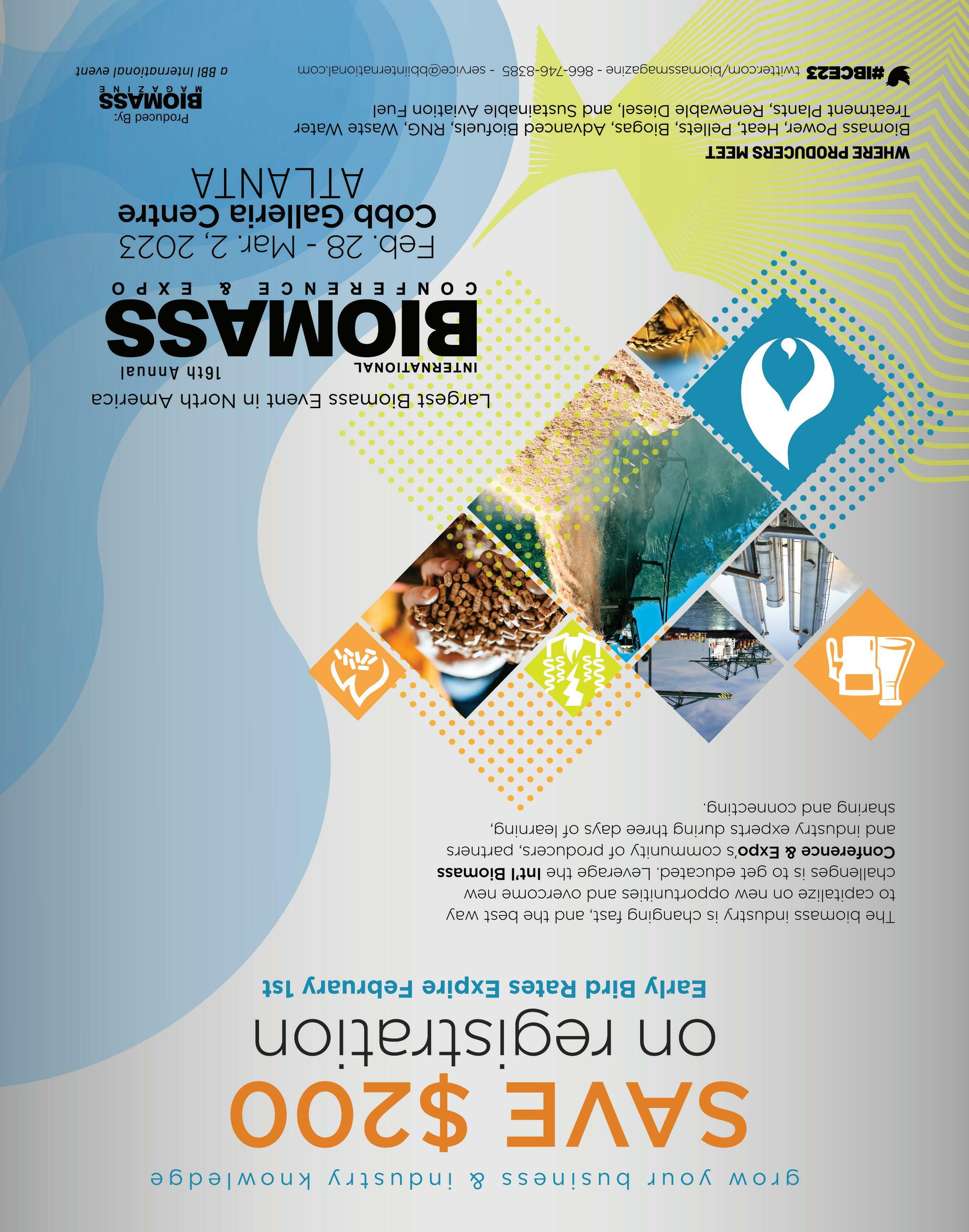 Now in its 16th year, the International Biomass Conference & Expo is expected to bring together more than 800 attendees, 140 exhibitors and 65 speakers from more than 21 countries. It is the largest gathering of biomass professionals and academics in the world. The conference provides relevant content and unparalleled networking opportunities in a dynamic business-to-business environment. In addition to abundant networking opportunities, the largest biomass conference in the world is renowned for its outstanding programming—powered by Biomass Magazine–that maintains a strong focus on commercial-scale biomass production, new technology, and near-term research and development. Join us at the International Biomass Conference & Expo as we enter this new and exciting era in biomass energy. 866-746-8385 | www.biomassconference.com
