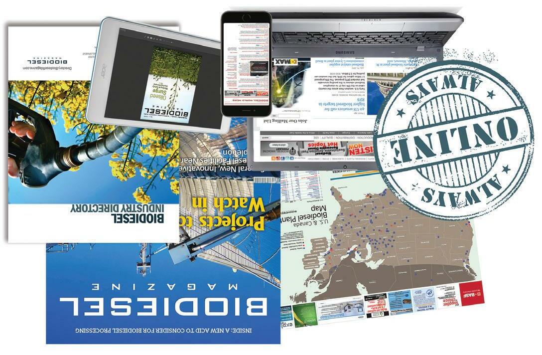 Subscriptions Subscriptions to Biodiesel Magazine are free of charge to everyone with the exception of a shipping and handling charge for any country outside the United States. To subscribe, visit www.biodieselmagazine.com or you can send your mailing address and payment (checks made out to BBI International) to: Biodiesel Magazine Subscriptions, 308 Second Ave. N., Suite 304, Grand Forks, ND 58203. You can also fax a subscription form to 701-746-5367. Reprints and Back Issues Select back issues are available for $3.95 each, plus shipping. Article reprints are also available for a fee. For more information, contact us at 701-746-8385 or service@bbiinternational.com. Advertising Biodiesel Magazine provides a specific topic delivered to a highly targeted audience. We are committed to editorial excellence and high-quality print production. To find out more about Biodiesel Magazine advertising opportunities, please contact us at 701-746-8385 or service@bbiinternational.com. Letters to the Editor We welcome letters to the editor. If you write us, please include your name, address and phone number. Letters may be edited for clarity and/or space. Send to Biodiesel Magazine Letters, 308 Second Ave. N., Suite 304, Grand Forks, ND 58203 or email asimet@bbiinternational. com.