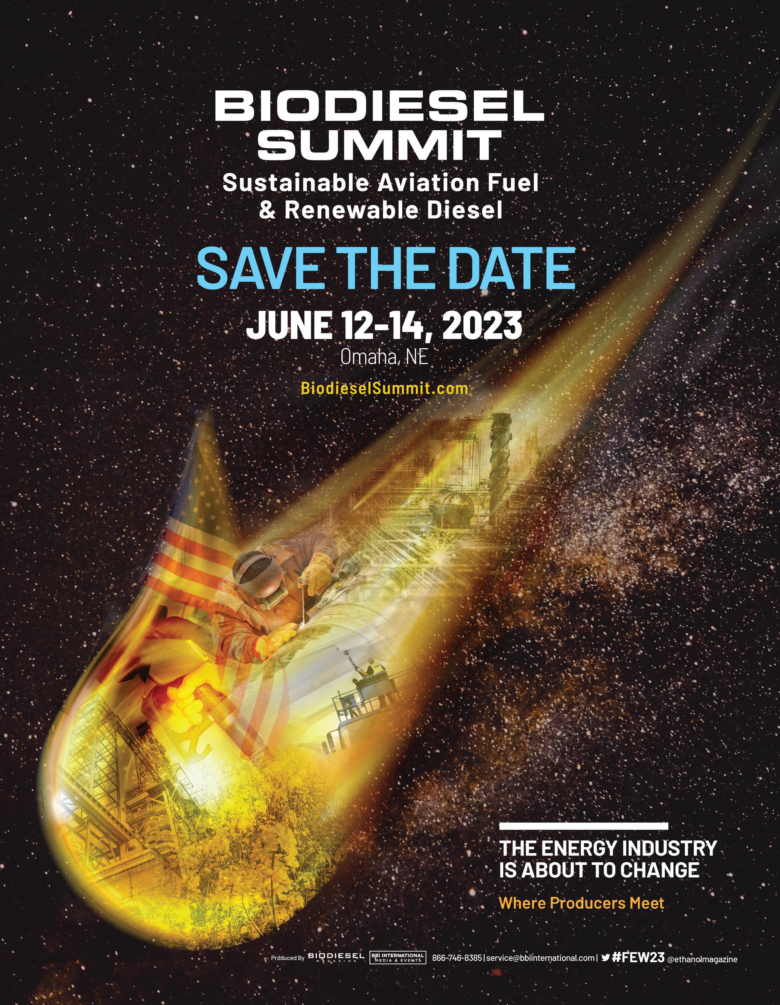 The Biodiesel & Renewable Diesel Summit is a forum designed for biodiesel and renewable diesel producers to learn about cutting-edge process technologies, new techniques and equipment to optimize existing production, and efficiencies to save money while increasing throughput and fuel quality. Produced by Biodiesel Magazine, this world-class event features premium content from technology providers, equipment vendors, consultants, engineers and producers to advance discussion and foster an environment of collaboration and networking through engaging presentations, fruitful discussion and compelling exhibitions with one purpose, to further the biomassbased diesel sector beyond its current limitations. (866) 746-8385 | BiodieselSummit.com