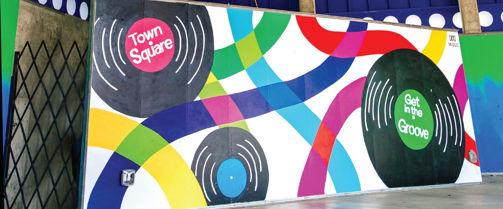 Can you walk us through the design and creation of the murals in the Town Square? Did the Three Brushketeers create the designs?