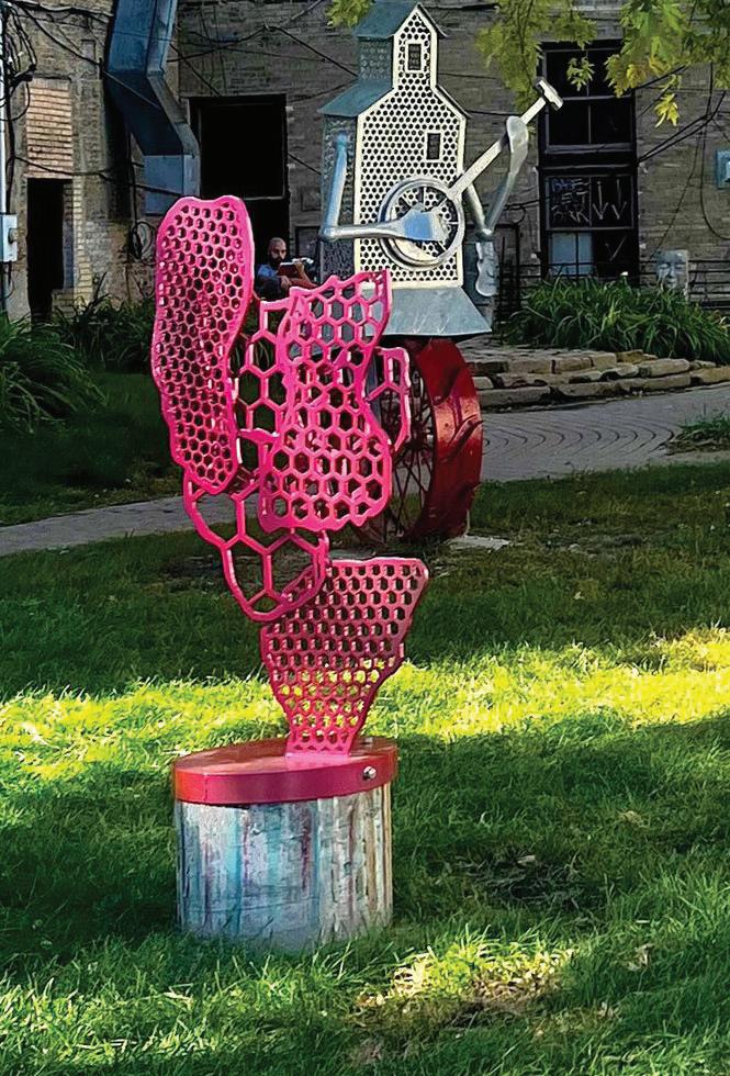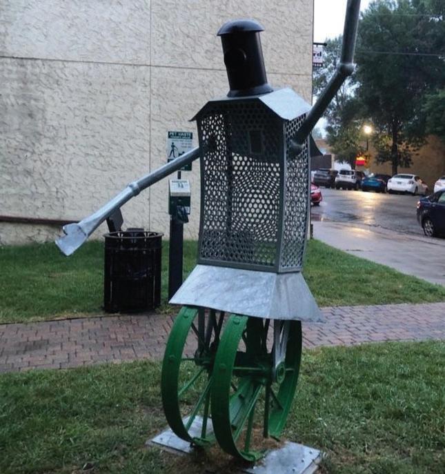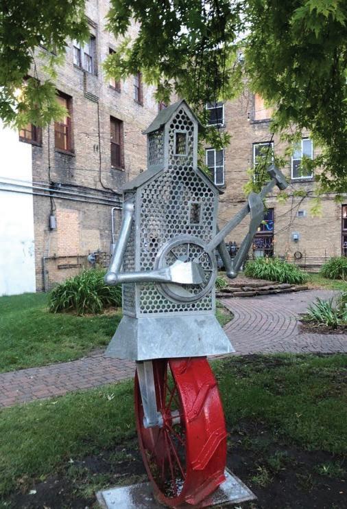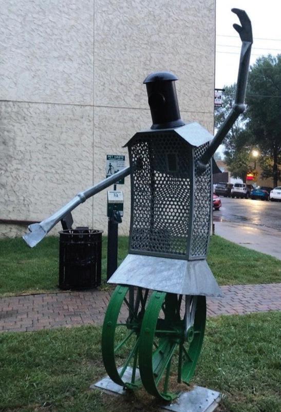 John Colle Rogers contributed the whimsical pair of sculptures titled âDancer and Player.â These works depict a looping relationship of inspiration, with the Dancer inspiring the Railroad Banjo Player and vice versa. The sculptures also incorporate elements of the Red River Valleyâs history, including a railroad wheel and hammer for the Banjo, a Rail-workerâs lamp for the head of the Dancer, and Grain Elevator bodies and Tractor Wheels for both ïŹgures. Rogers shared his pleasure in helping to activate Pillsbury Park with these playful and meaningful works, offering thanks to everyone involved, including his fellow artists.