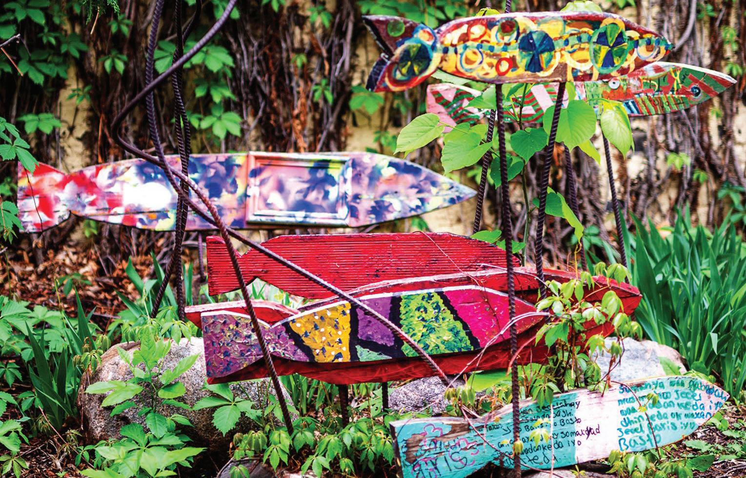 Adam Kemp has been working on his âSchool of Fishâ project for over 20 years. The latest iteration begins in the village of Widdington at the Widdington Box Gallery, a restored phone box, and journeys all the way to Pillsbury Park. The âschoolâ is a collaborative effort featuring ïŹsh created by his dad, his friend Mo, his brother Mat, three sushi chefs from Heathrow Airport, clients of DHI, and artists from Polk County DAC in East Grand Forks. Kemp shared his excitement about working with such a wide array of contributors, saying, âThey knocked it out of the parkâor rather, into the park. Although the trees are the true stars of the park, the sculptures created by so many talented people make it even more welcoming.â He credits Hanna Sage Kemp for encouraging him to complete the project.