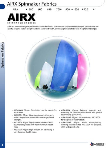• AIRX-900N: 67gsm: Extreme strength and durability for offshore performance and general race / cruise applications. • AIRX-620NS: 37gsm: Silicone coated AIRX-600N for dinghies and sportsboats. • AIRX-720NS: 45gsm: World Championship winning silicone coated AIRX-700N for dinghies, skiffs and sportsboats.