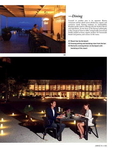 Located in another area is its signature Kusina restaurant and bar which serves wholesome, organic and nutritious meals. Putting emphasis on sustainability, Kandaya prides itself in offering only the freshest flavors and ingredients. At the heart of the Kusina’s philosophy is the concept of “farm to table,” using locally sourced and freshly picked in-house organic produce for homemade breads and pastries, and courses on the menu. 01 Resort bar by the beach 02 Evening setting and backdrop view from the bar 03 Romantic evening dinner on the beach with backdrop of the resort