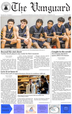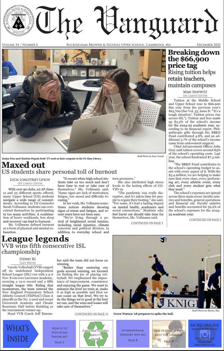 The Vanguard is the official student newspaper of the Buckingham Browne & Nichols Upper School, which has 543 students, 96 faculty members, and 64 staff members. Affiliated with the Columbia Scholastic Press Association, the paper is a forum for differing views and welcomes comments from its readers in the form of Letters to the Editor. No anonymous letters will be printed. The Vanguard reserves the right to edit all letters for length. The Vanguard publishes eight issues per annual volume and prints between 500 and 800 copies of each issue. About 200 of those are mailed out; the rest are distributed around campus.