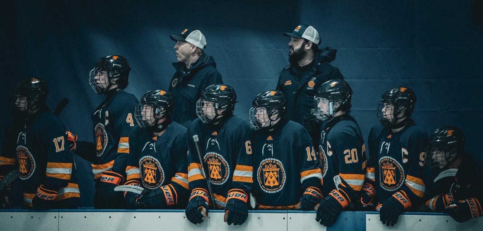 Boys’ Varsity Hockey players await their turns to be subbed into the game.