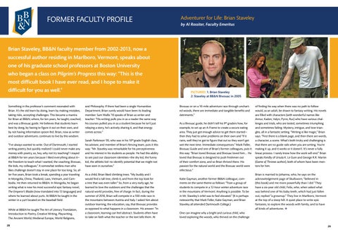 successful author residing in Marlboro, Vermont, speaks about one of his graduate school professors at Boston University who began a class on Pilgrim’s Progress this way: “This is the most difficult book I have ever read, and I hope to make it difficult for you as well.” Something in the professor’s comment resonated with Brian. It’s the old learn by doing, learn by making mistakes, taking risks, accepting challenges. This became a mantra for Brian at BB&N, where, for ten years, he taught, coached, and was a Bivouac guide. He believes that students learn best by dong, by having to figure it out on their own, and by not having information spoon-fed. Brian, now as writer and outdoor adventurer, continues to live by this wisdom. “I’ve always wanted to write. Out of Dartmouth, I started writing poetry, but quickly realized I could never make any money with poetry, so, hey, why not try teaching? I stayed at BB&N for ten years because I liked everything about it— the freedom to teach what I wanted, the coaching, Bivouac, the kids, my colleagues.” A somewhat restless man who likes challenge doesn’t stay in one place for too long. So, after five years, Brian took a break, spending a year traveling in Mongolia, China, Thailand, Laos, Vietnam, and Cambodia. He then returned to BB&N. In Mongolia, he began writing what is now his most successful epic fantasy novel, The Emperor’s Blades (now translated into 13 languages) and where he learned about yurts. At BB&N he taught in the winter in a yurt located on the baseball field. While at BB&N he taught The Art of Literary Translation, Introduction to Poetry, Creative Writing, Playwriting, The Ancient World, Medieval Europe, World Religions, 28 22