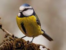 Light twitterings from trees herald blue tits with their distinctive yellow and blue plumage and black face mask.