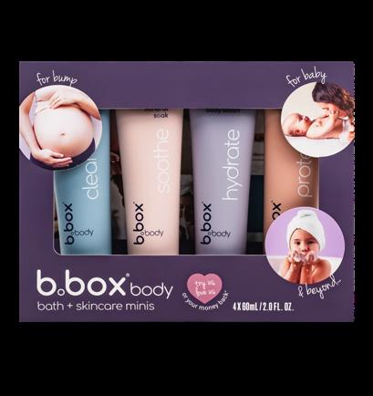 cleanse, soothe, hydrate + protect baby’s skin on the go with this convenient set of b.box body mini must haves! Sized for travel, the 60ml tubes slip easily into the diaper bag or wash bag to ensure that nourishing baby skincare is on hand, wherever the day takes you.
