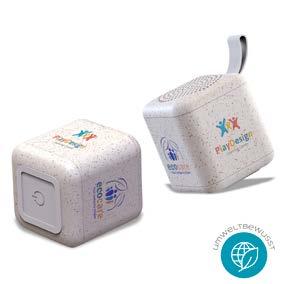 Klein aber oho. Dieser ansprechende Mini Lautsprecher ist aus Biokunststoff mit einer Silikonschlaufe. Er hat eine Reichweite bis 10 Meter und kommt inklusive USB-Ladekabel.